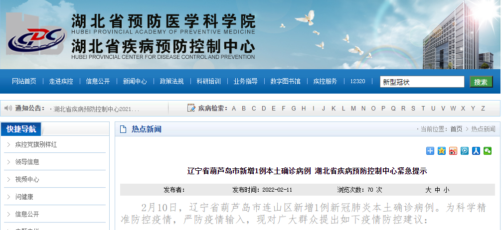 2月10日,辽宁省葫芦岛市连山区新增1例新冠肺炎本土确诊病例。为科学精准防控疫情,严防疫情输入,现对广大群众提出如下疫情防控建议:一、2022年1月25日(含)以来有辽宁省葫芦岛市连山区旅居史的来鄂返鄂人员在做好个人防护的情况下,请主动向当地社区进行健康申报,并配合当地疫情防控指挥部的所有防控措施。如有疑问或转码有误可拨打我省各级疾控中心咨询热线(号码附后)。二、鉴于当前的疫情形势,如无必须,建议近期不要前往辽宁省葫芦岛市连山区。三、从辽宁省葫芦岛市连山区来鄂返鄂的人员,请提前了解我省当地防控要求;来鄂返鄂途中,请做好个人防护;来鄂返鄂后,应主动配合我省相关防控措施。四、广大群众要继续时刻保持良好的个人防护意识,养成随身携带口罩,科学规范佩戴口罩(尤其是在乘坐公共交通工具和在公共场所活动时)、勤洗手、常通风、保持安全社交距离的卫生习惯;不扎堆、不聚会,倡导健康生活方式。五、如出现发热、咳嗽、腹泻、乏力等症状,要佩戴一次性医用口罩及以上级别口罩,及时到就近的发热门诊进行排查和诊疗,就医过程尽量避免乘坐公共交通工具。六、接种新冠疫苗是预防控制新冠肺炎传播的最经济、最有效、最方便的措施,更是每一位公民应尽的责任和义务,请符合新冠疫苗接种条件的群众积极主动参与新冠病毒疫苗接种,携手共筑全民免疫屏障。
