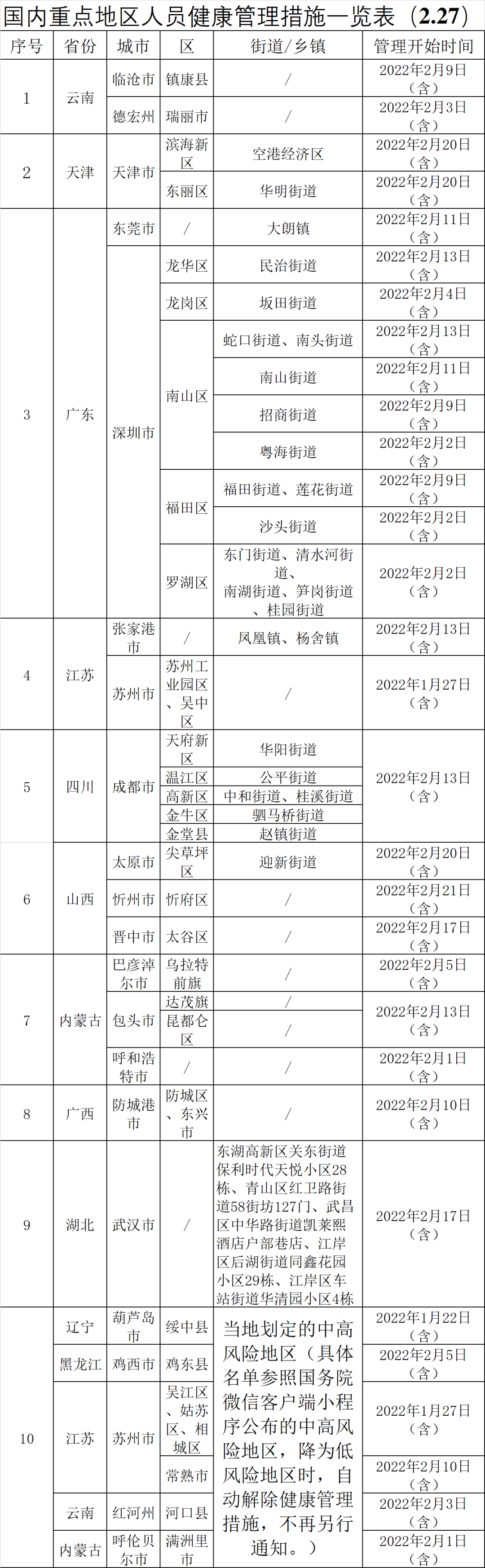 2月27日,天津市滨海新区空港经济区一地升级为高风险地区,山西省太原市尖草坪区新增多例确诊病例。根据湖北省防指调整重点地区管控措施,为严防疫情输入,科学精准防控疫情,有效控制和降低疫情传播风险,对2022年2月20日(含)以来有天津市滨海新区空港经济区;2022年2月20日(含)以来有山西省太原市尖草坪区迎新街道旅居史的来鄂返鄂人员实施健康管理措施。现对广大群众提出如下疫情防控提醒: