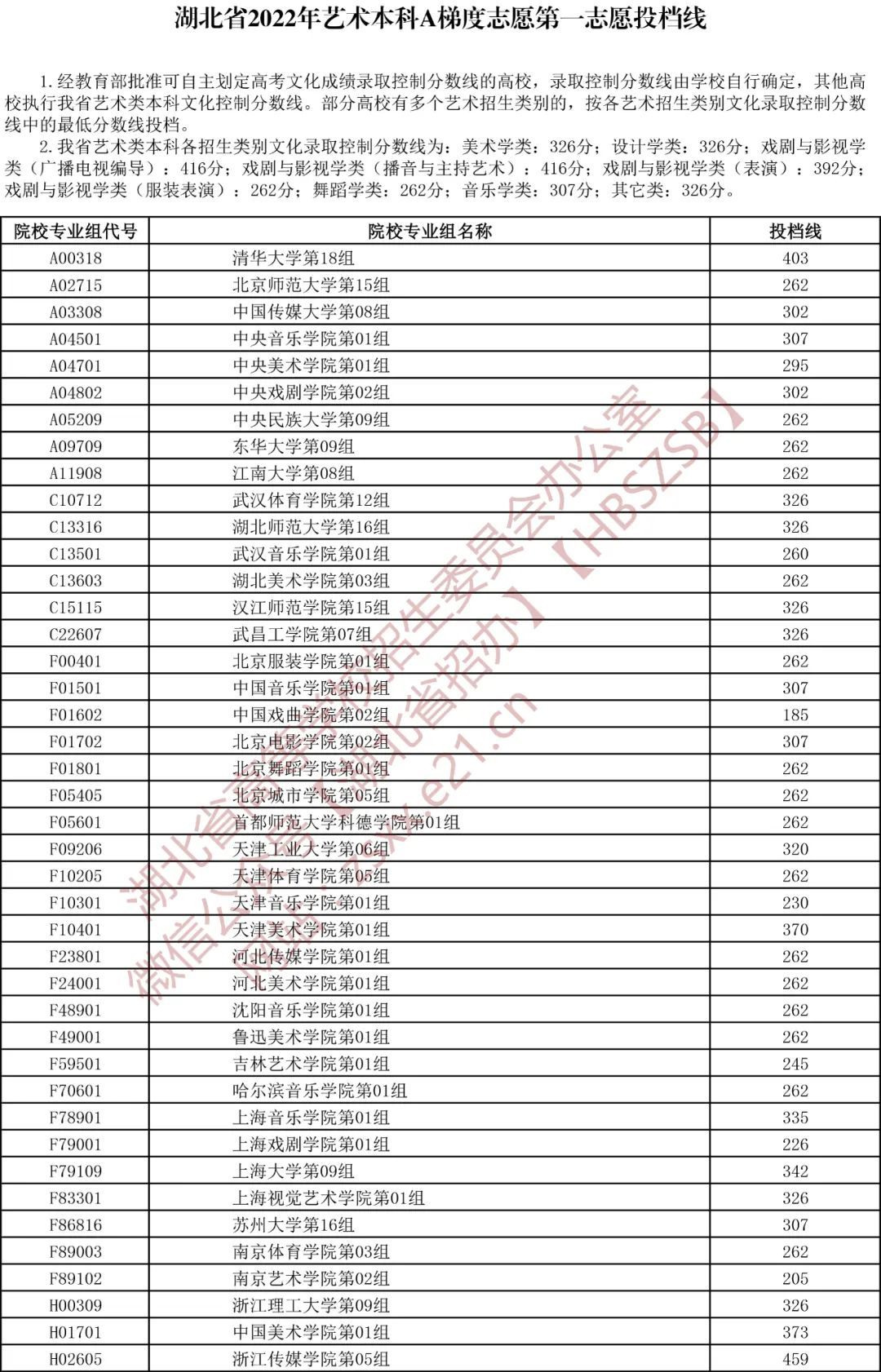 7月10日晚,湖北省招办公布湖北省2022年艺术本科A梯度志愿第一志愿投档线和湖北省2022年本科提前批单设志愿录取院校投档线。