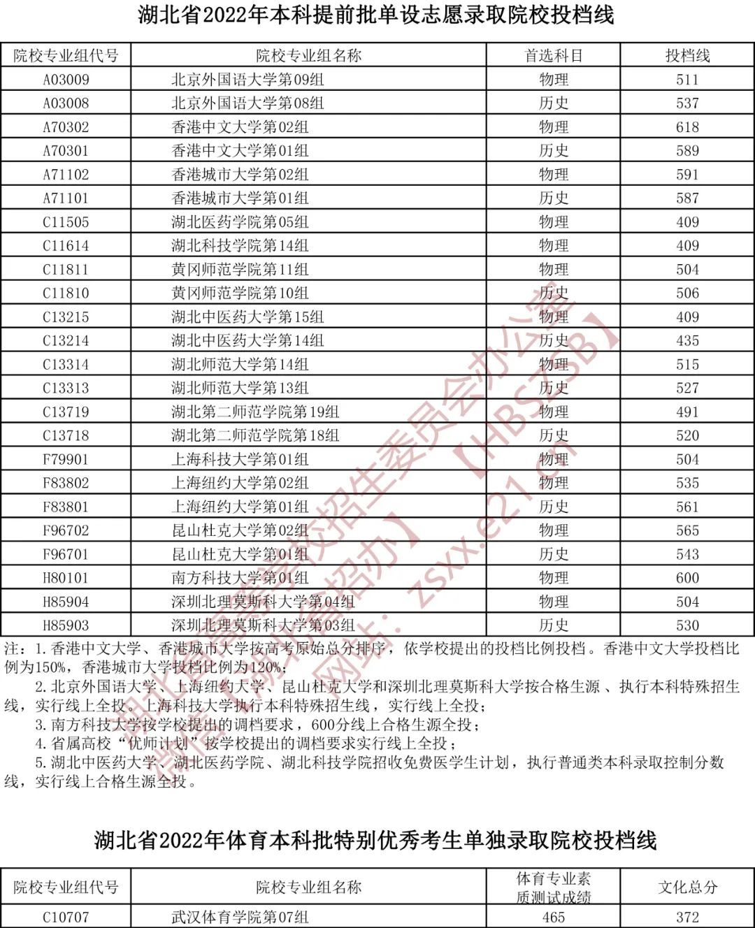 湖北省2022年本科提前批单设志愿录取院校投档线