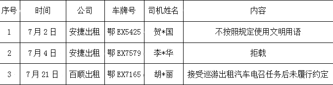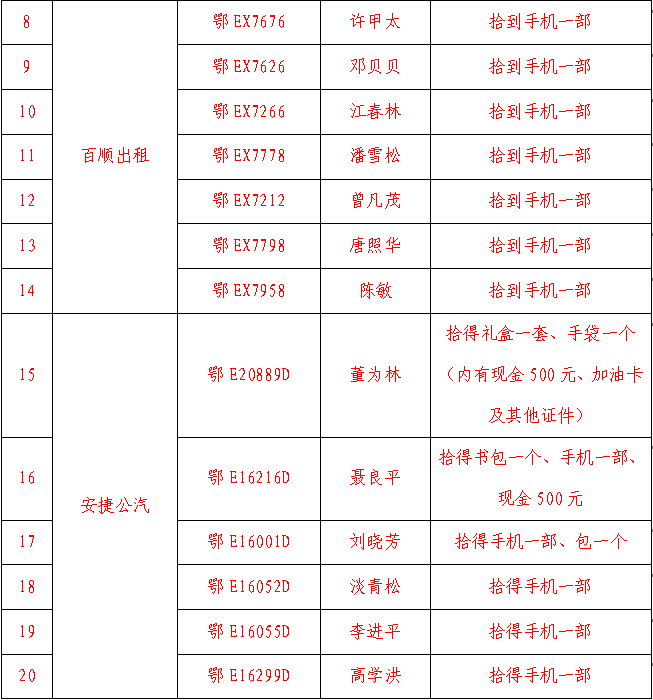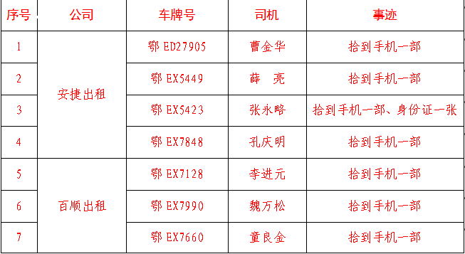 鄂EX7428驾驶员曹清(安捷出租):7月1日,曹师傅在车上拾得一部手机,与乘客取得联系后,他第一时间将手机送还给失主。为曹师傅拾金不昧的精神点赞,特此表扬!