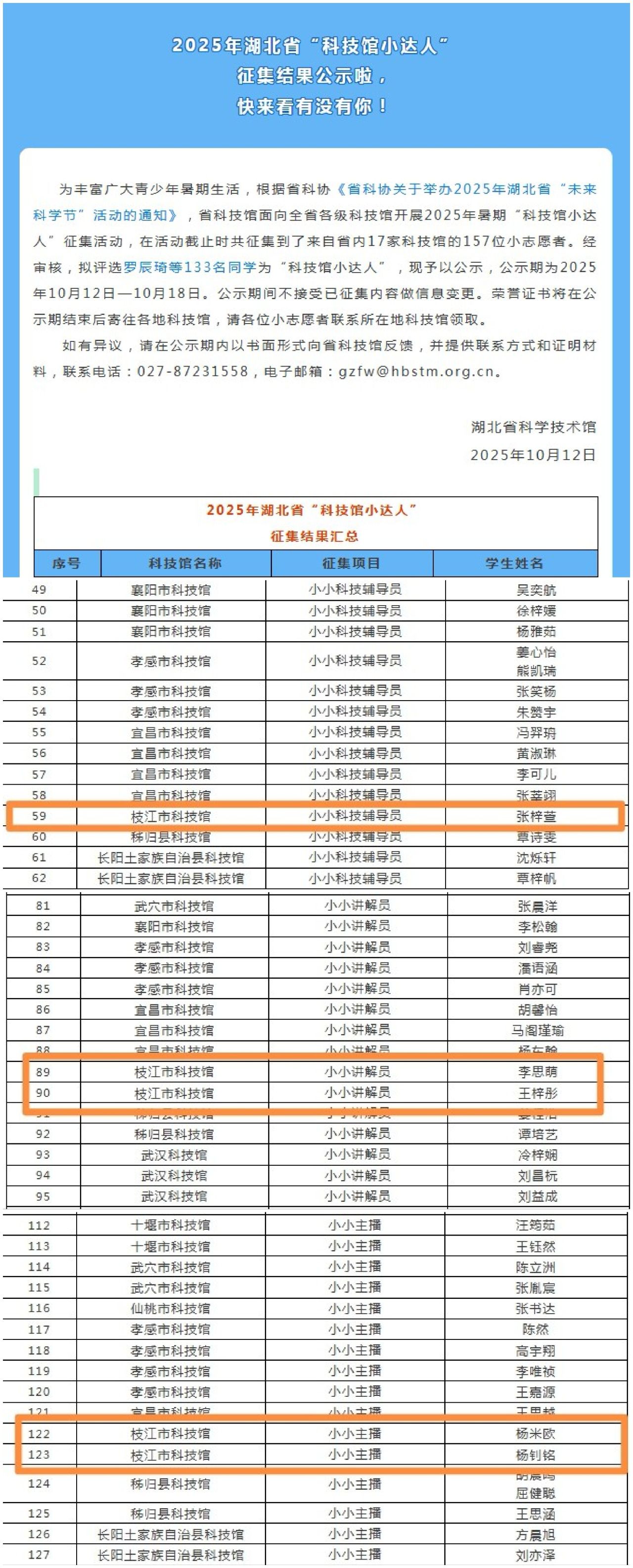 在2025年湖北省“科技馆小达人”征集活动中,枝江市科技馆选送的五位“科技馆小达人”表现突出,荣获佳绩!