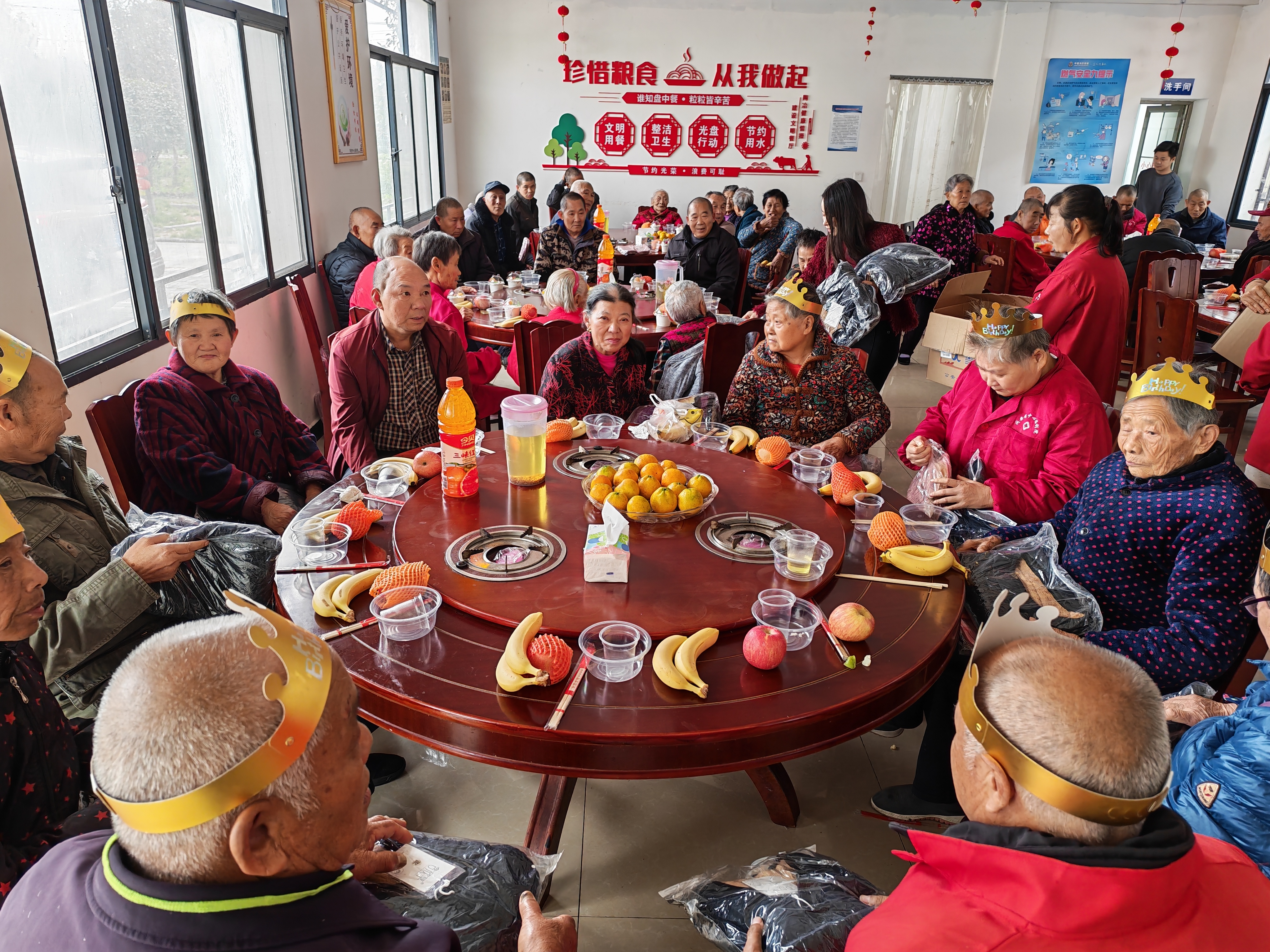 活动现场布置得温馨雅致,定制的生日蛋糕静静摆放于会场中央的桌上,棉背心、棉拖鞋、新鲜水果等慰问品整齐陈列。在工作人员的细致安排下,老人们身着整洁衣物,笑容满面地井然就座。