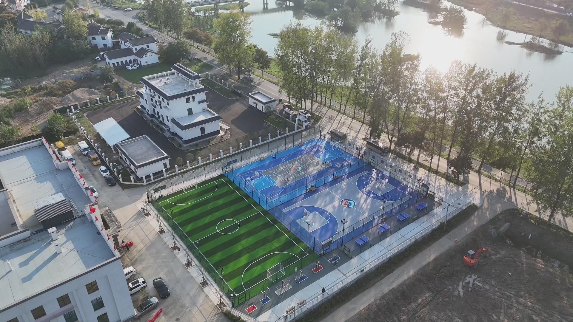 每到傍晚,夕阳为玛瑙河畔镀上暖金色,运动中心也迎来一天中最热闹的时刻。篮球场上,传球、跳跃,篮球入网声此起彼伏;健身区里,村民们一边锻炼一边闲聊,享受着运动带来的乐趣,满是热闹与温馨。