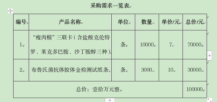 二、采购内容:拟对生猪“瘦肉精”、牛羊布病检测试剂卡进行采购
