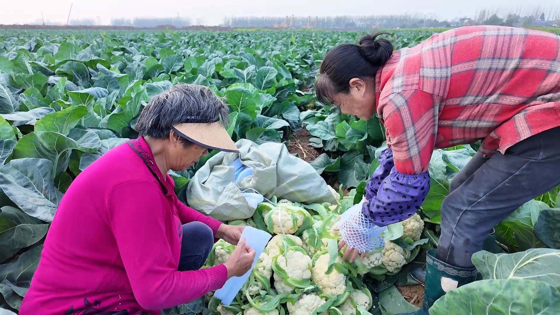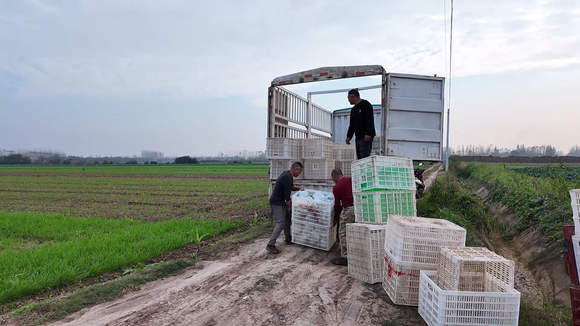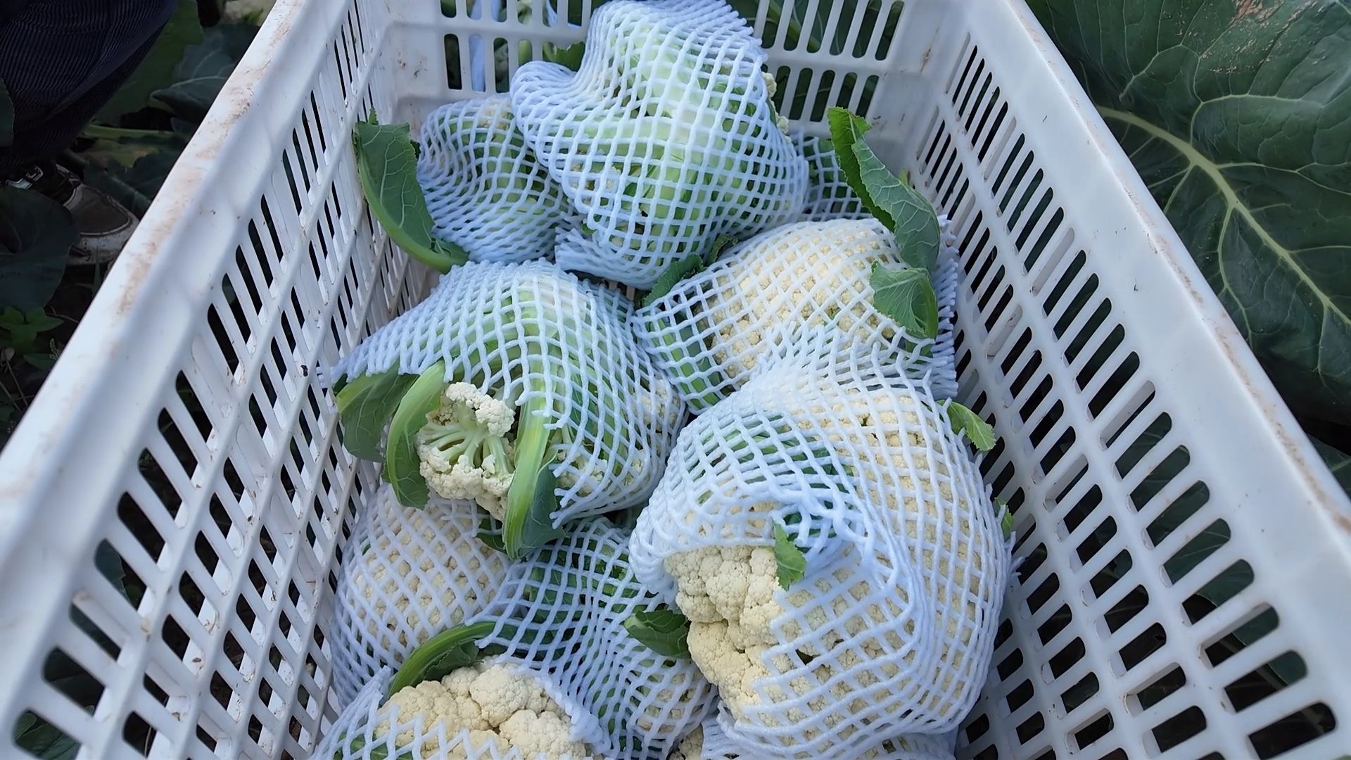 在地头的另一侧,合作社的社员们正忙着将打包好的花菜装车。一筐筐新鲜翠绿的花菜被整齐码放,即将启程。