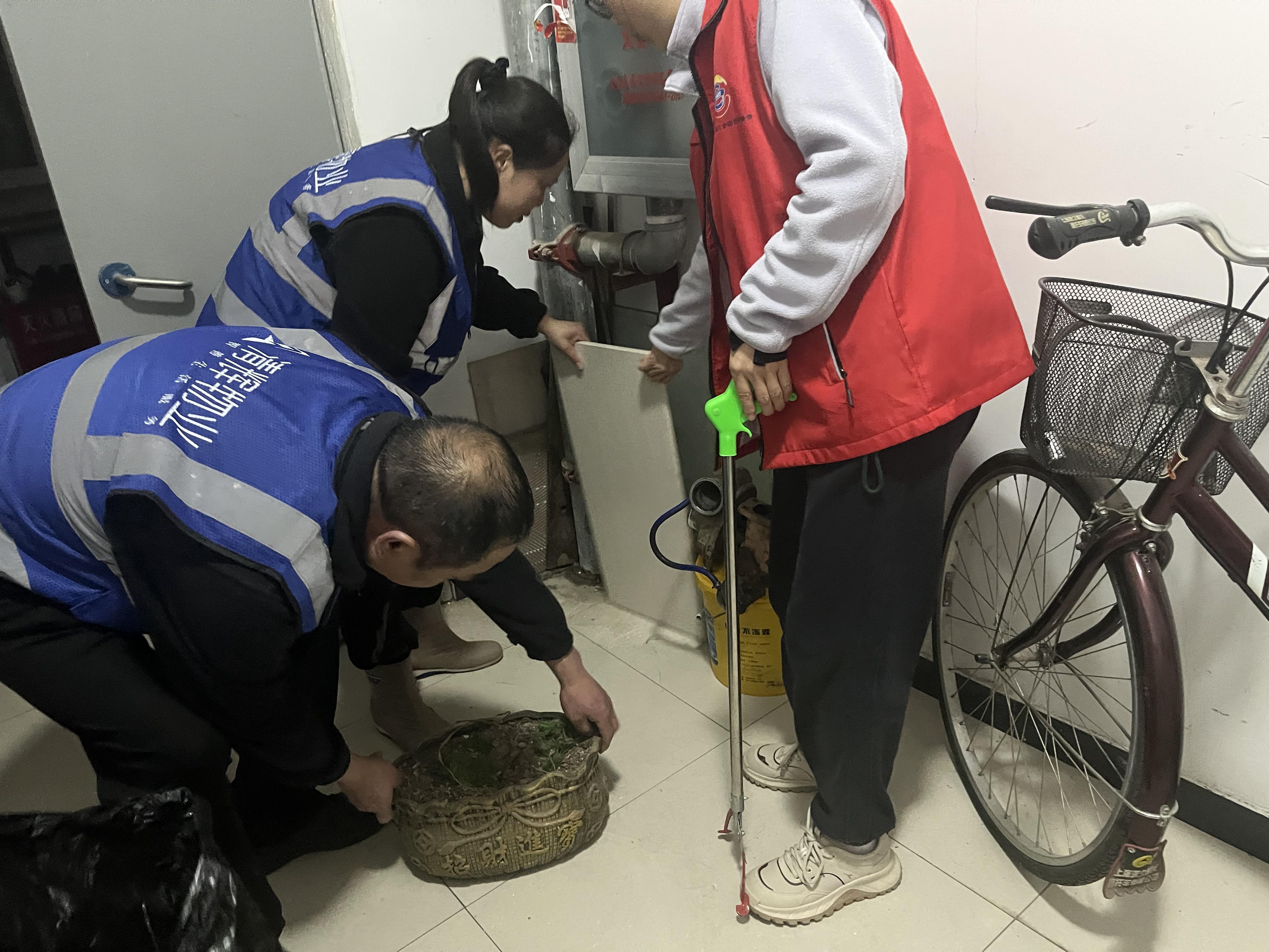 “张爷爷,这些木头堆在水电井里,检修师傅都没法干活,还容易引发电线短路。”社区网格员丰丽蹲在6楼水电井旁,耐心地帮70岁的张大爷清理出十余根木条。张大爷不好意思地挠挠头:“以前在村里习惯了,以后一定注意。”
