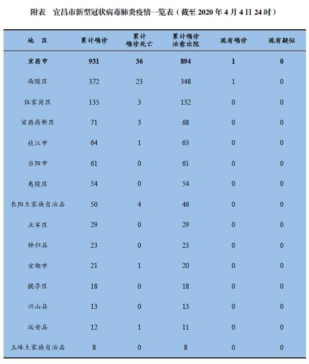 截至4月4日24时,累计报告确诊病例931例,其中西陵区372例、伍家岗区135例、宜昌高新区71例、枝江市64例、当阳市61例、夷陵区54例、长阳土家族自治县50例、点军区29例、秭归县23例、宜都市21例、猇亭区18例、兴山县13例、远安县12例、五峰土家族自治县8例。