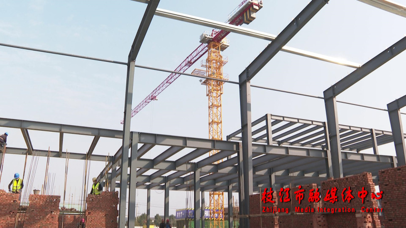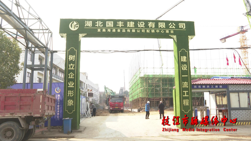 在宜昌海通食品有限公司配销中心项目施工现场,吊塔高悬,焊花飞溅,机器轰鸣,工人们有序忙碌,呈现出一派火热的建设图景。