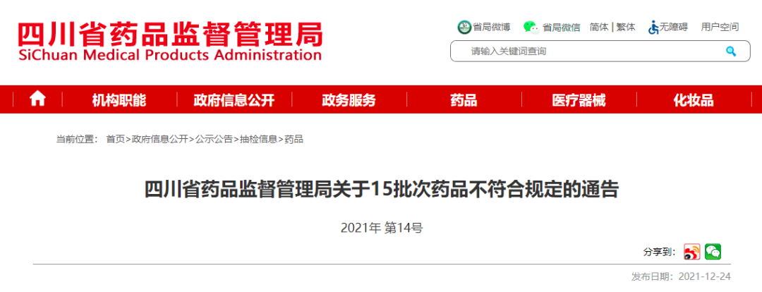 四川省药品监管局发布了关于15批次药品不符合规定的通告