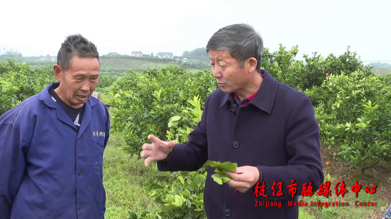 “把这个溃疡病的叶片、枝子清理掉、剪掉,剪掉后用袋子装起来拿出去烧掉。再就是用清园的药剂清园,清园也是防溃疡病的。”培训期间,农技人员还分头到蔡家溪村等地的脐橙园里查看树势、解答疑问、指导当前田管要点。