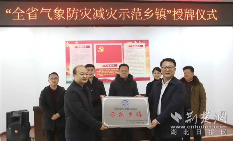1月13日,宜昌市气象局党组书记、局长余海涛(前左)为枝江市仙女镇授牌“湖北省气象防灾减灾示范乡镇”。闻玉强 摄