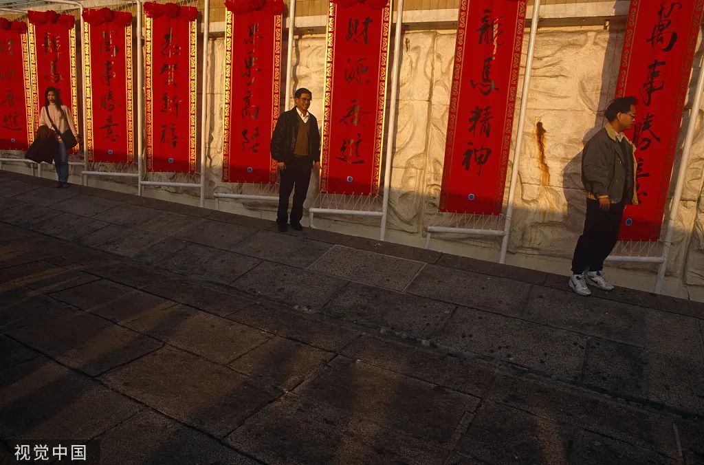 1995年,香港九龙湾尖沙咀,阳光正好,三名市民站在满墙春联前。