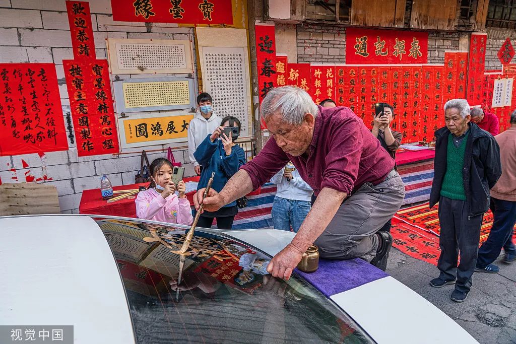 2021年2月2日,广东佛山,书法工匠给车写字。
