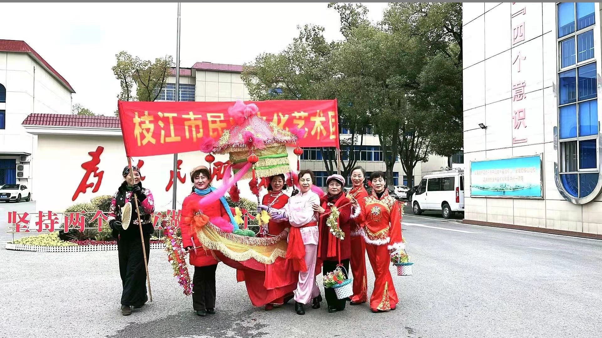 据悉,民俗拜年活动从正月初六开始,将持续到正月十五,截止目前,已累计表演五十余场。此次活动由枝江市文化馆指导,组织了枝江民间文化艺术团的文艺志愿者们前往各个单位、社区进行快闪巡演,为全市人民送上新年的祝福,在营造喜庆祥和的节日氛围的同时,也让市民更多的了解、感知枝江民俗文化的独特魅力。