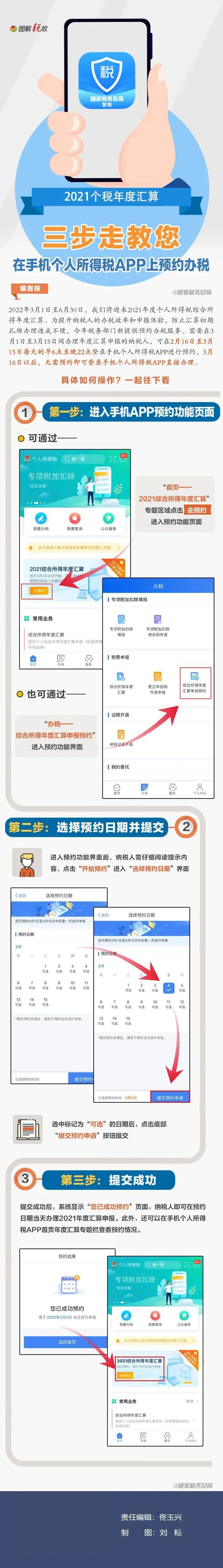 2022年3月1日至6月30日,我们将迎来2021年度个人所得税综合所得年度汇算。为提升纳税人的办税效率和申报体验,防止汇算初期扎堆办理造成不便,今年税务部门新提供预约办税服务。需要在3月1日至3月15日间办理年度汇算申报的纳税人,可在2月16日至3月15日每天的早6点至晚22点登录手机个人所得税APP进行预约,3月16日以后,无需预约即可登录手机个人所得税APP直接办理。