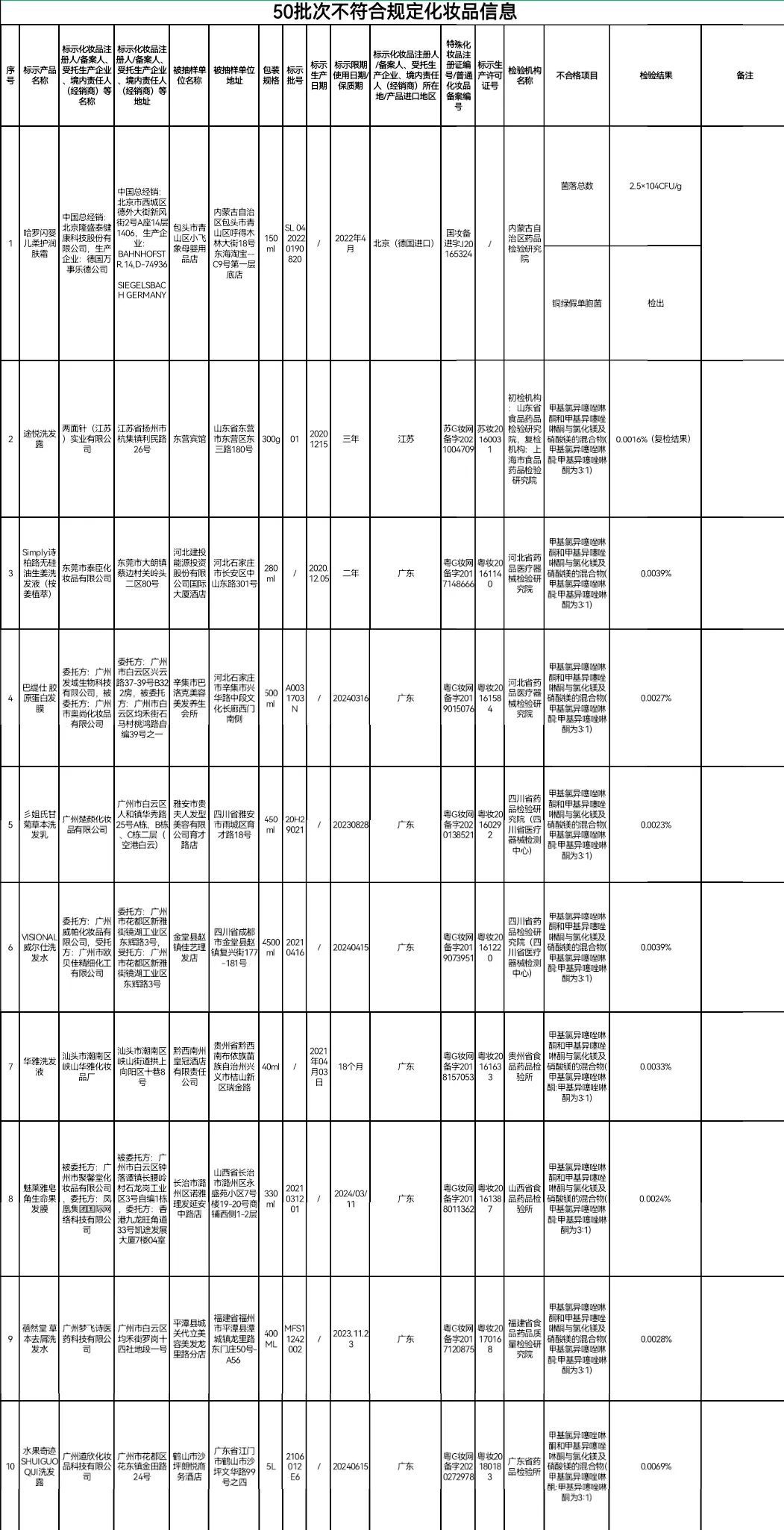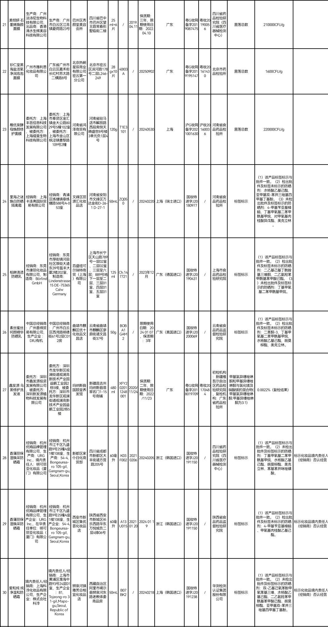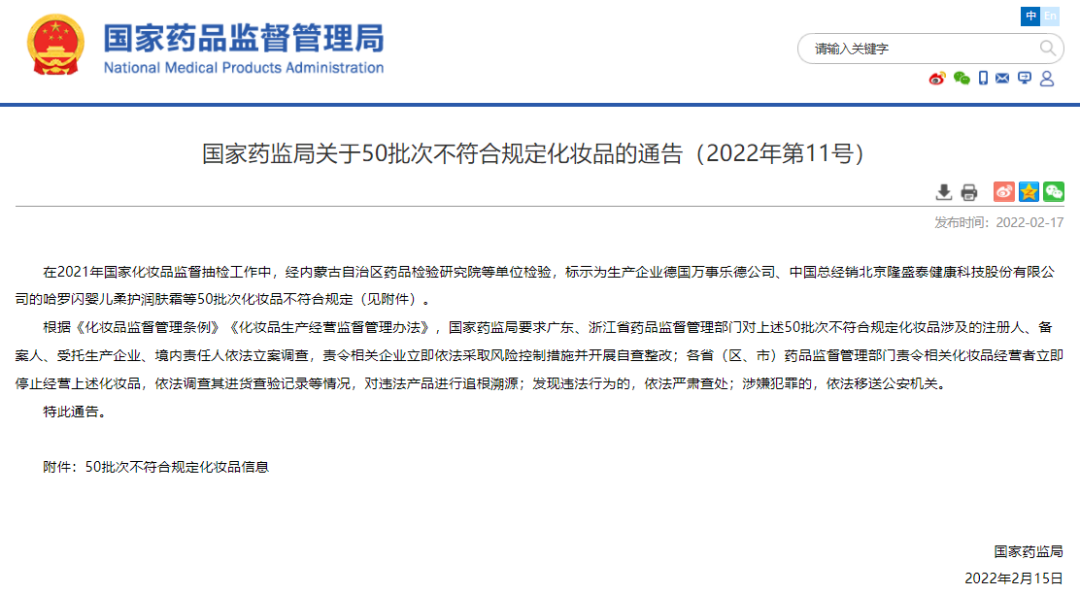 据国家药监局网站,在2021年国家化妆品监督抽检工作中,50批次化妆品不符合规定。包括标示为生产企业德国万事乐德公司、中国总经销北京隆盛泰健康科技股份有限公司的哈罗闪婴儿柔护润肤霜;标示为生产企业两面针(江苏)实业有限公司的途悦洗发露 ;标示为经销者资生堂(中国)投资有限公司的安热沙水能户外清透防晒乳SPF50+·PA+++;标示为委托方上海丰邑信息科技发展有限公司,被委托方上海缇曼生物科技有限公司的稚优泉酵母焕颜修护面膜等。