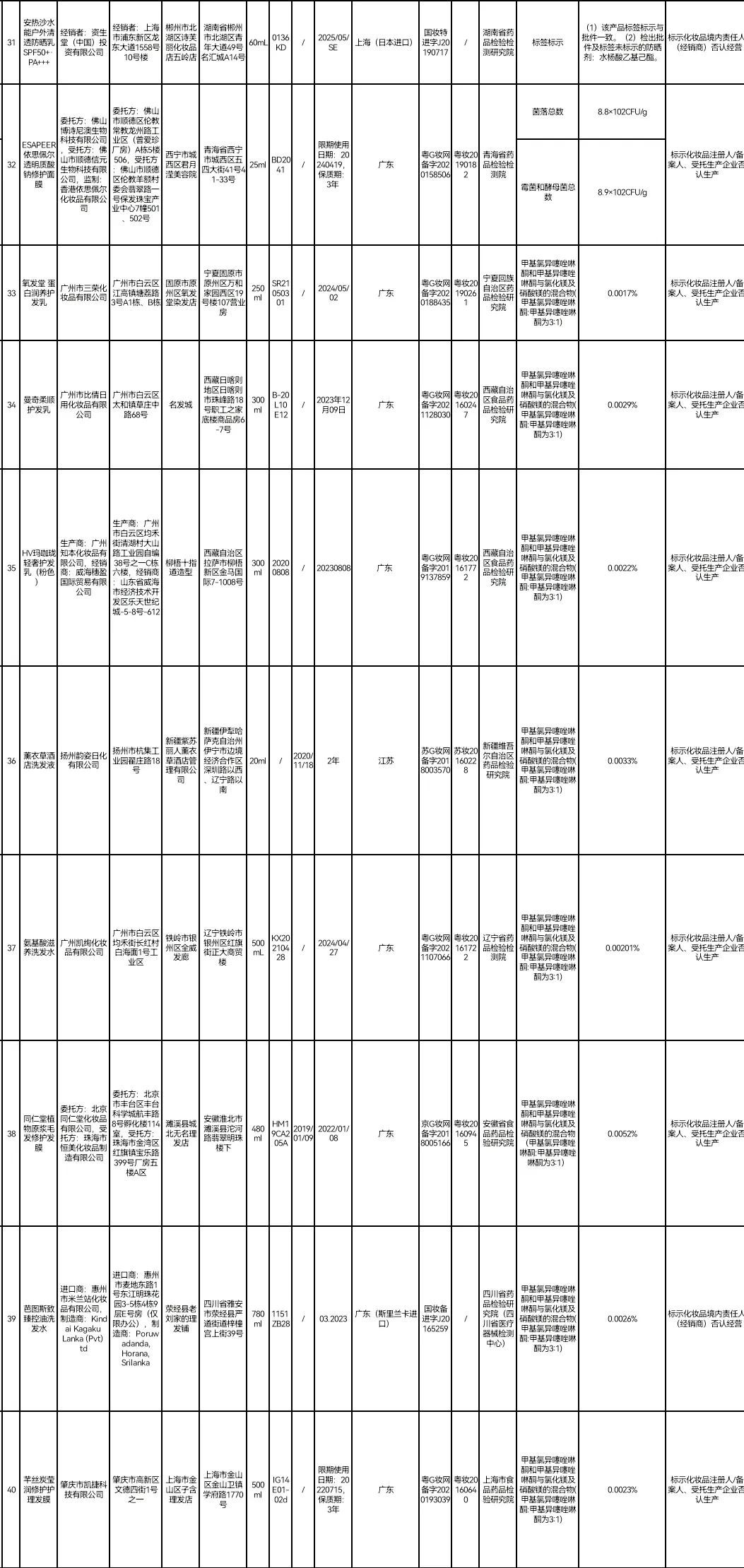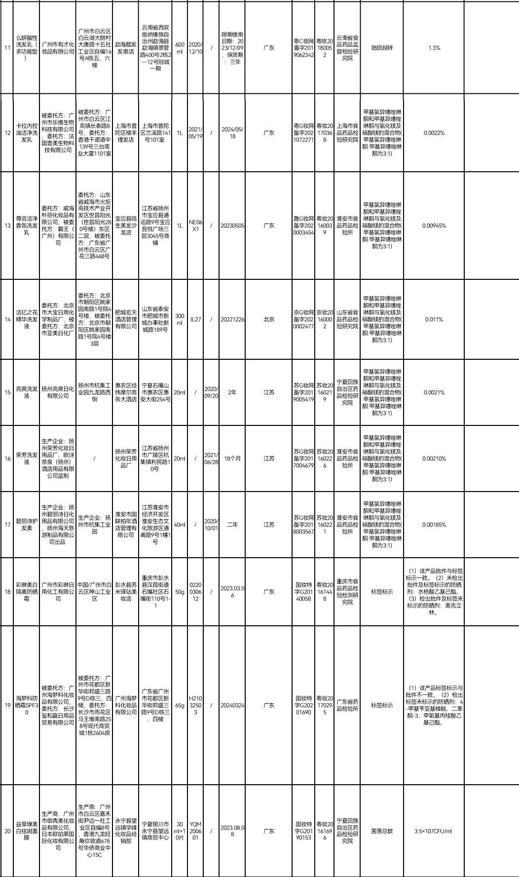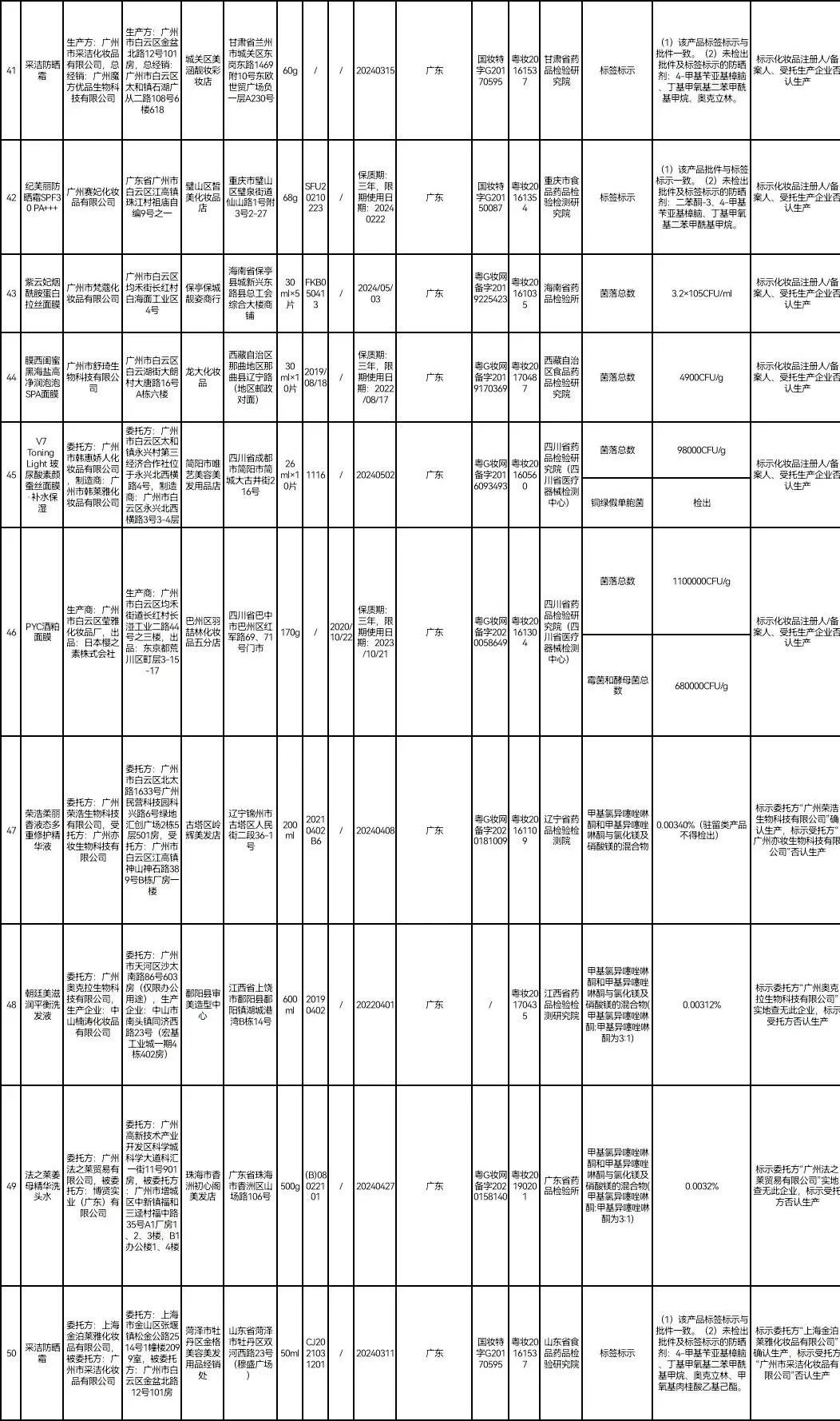 据国家药监局网站,在2021年国家化妆品监督抽检工作中,50批次化妆品不符合规定。包括标示为生产企业德国万事乐德公司、中国总经销北京隆盛泰健康科技股份有限公司的哈罗闪婴儿柔护润肤霜;标示为生产企业两面针(江苏)实业有限公司的途悦洗发露 ;标示为经销者资生堂(中国)投资有限公司的安热沙水能户外清透防晒乳SPF50+·PA+++;标示为委托方上海丰邑信息科技发展有限公司,被委托方上海缇曼生物科技有限公司的稚优泉酵母焕颜修护面膜等。