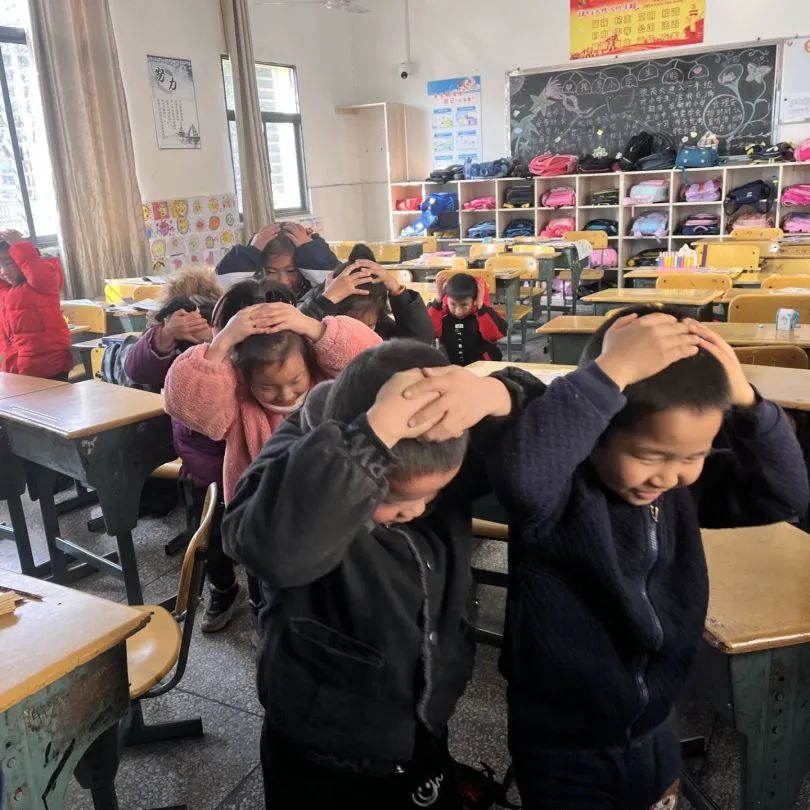 随着应急警报声响起,各班级教师立即组织同学们“紧急避险”。按照应急避险知识操作,同学们迅速抱头、闭眼,重心下移蜷缩躲在课桌下方和墙角。当接到疏散指令后,各班同学在老师的指挥下根据演练方案,按照指定路线,有序离开教室到大操场集合。