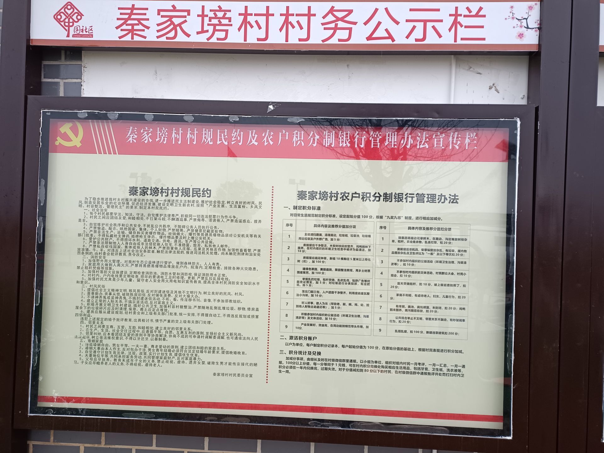“玛瑙河畔秦家塝,山靑水秀是我家;遵纪守法安本分,爱党爱国爱家乡”。走进秦家塝村村委会,村务宣传栏上的村规民约采用顺口溜、七字句等短小精悍的语句,读起来朗朗上口、入脑入心。