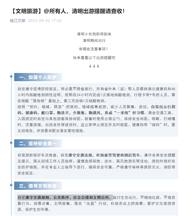 枝江融媒(通讯员 汪诗佳)临近清明,枝江市文旅局组合式推出“春季赏花线路图”,将东方年华、同心花海、百里洲梨园和白鸭寺公园等一批A级景区、乡村旅游点、公园进行“打包串联”,同时向市民游客线上发布《文明旅游倡议书》,倡议市民游客践行“自觉遵守交通规则、公共秩序、社会公德和文明公约”的文明旅游理念。
