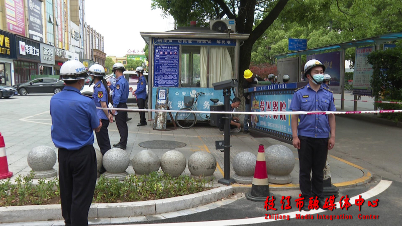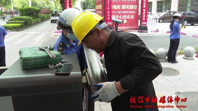 4月26日下午,在迎宾大道妙尚商业广场前,枝江市城管执法局综合执法大队执法人员拉起警戒线,公开拆除停车场自动收费设施的升降式道闸。