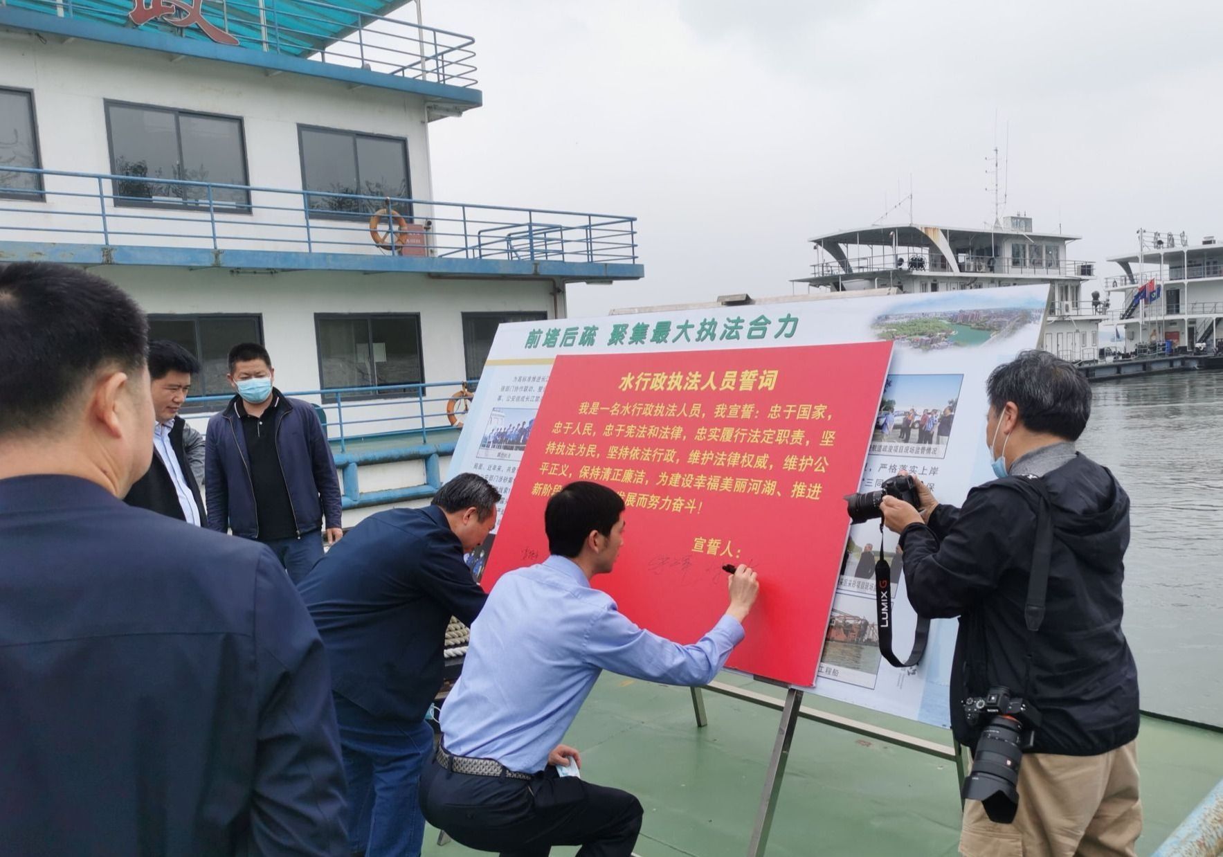 省水利厅砂管局副总队长李亮作动员讲话,并组织全体参与行动人员宣誓和签名。行动期间,主要对沿江河汊、采砂船舶集中停靠点、锚地等敏感水域、重要目标进行巡查检查,对江面上疑似隐形采砂船舶、疑似运输江砂船舶进行登船检查,确保沿江各级部门联合紧密,上下流域联动,形成执法合力。