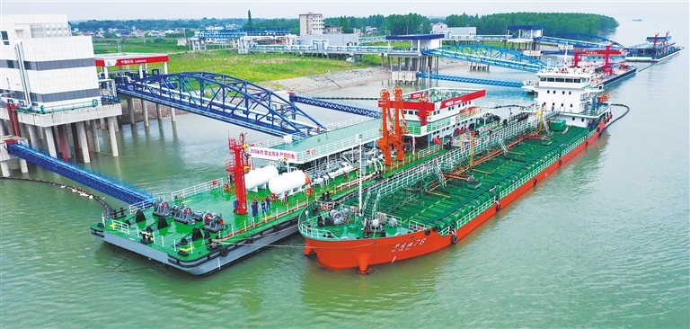 宜昌港枝江港区油库码头正式投入运营 2022-05-26 10:24 0 5月25日,一艘大型油轮在湖北宜昌港枝江港区油库码头中石化油品泊位卸载成品油,该泊位的投入使用,标志着宜昌港枝江港区油库码头正式投入运营。码头位于枝江市罗家河水域,共建有3个5000吨级油品泊位,设计年通过能力310万吨。 来源:经济日报