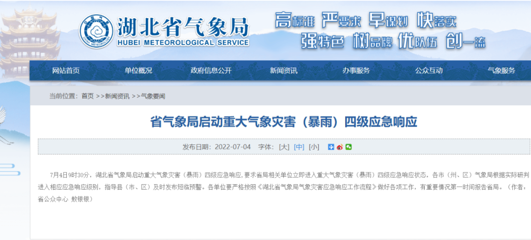 湖北省气象局启动重大气象灾害(暴雨)四级应急响应