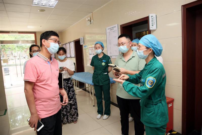 王军一行听取了该院副院长周会英对胸痛中心建设情况的汇报,王军对胸痛中心建设的情况进行点评,并与胸痛中心相关人员进行了提问与交流,同时查看了资料、网络数据填报情况,并指出不足与改进意见。随后,王军一行到该院急诊科、心内科、预检分诊,实地考察了胸痛中心运行情况,随机对医生、护士、120急救人员、安保等工作人员进行抽查提问。