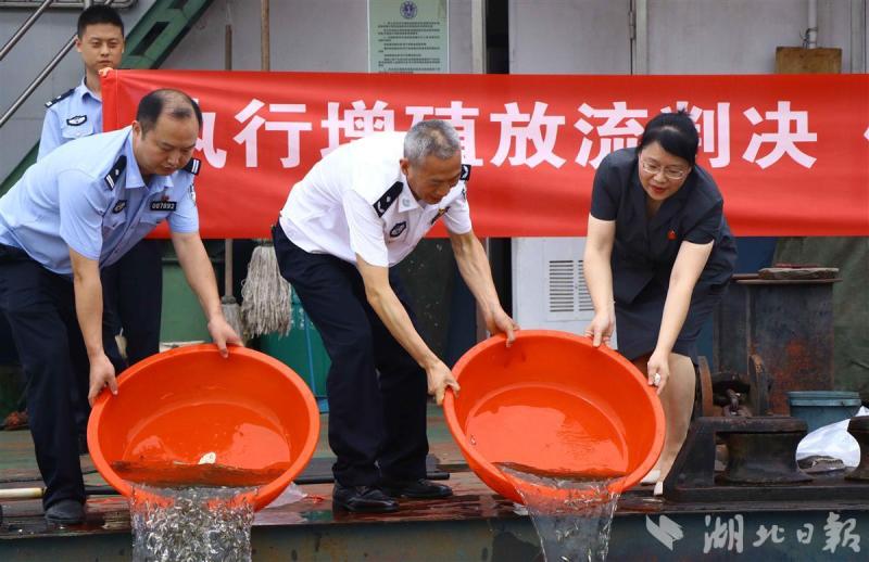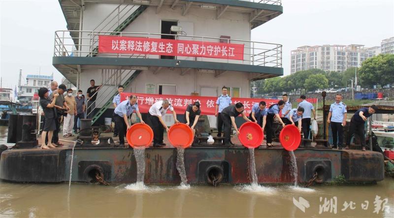 7月6日,枝江在长航宜昌分局枝江派出所码头,向长江放流鱼苗11.73万尾。3名非法捕捞当事人及家属现场接受教育,并承担生态修复费用1760元。