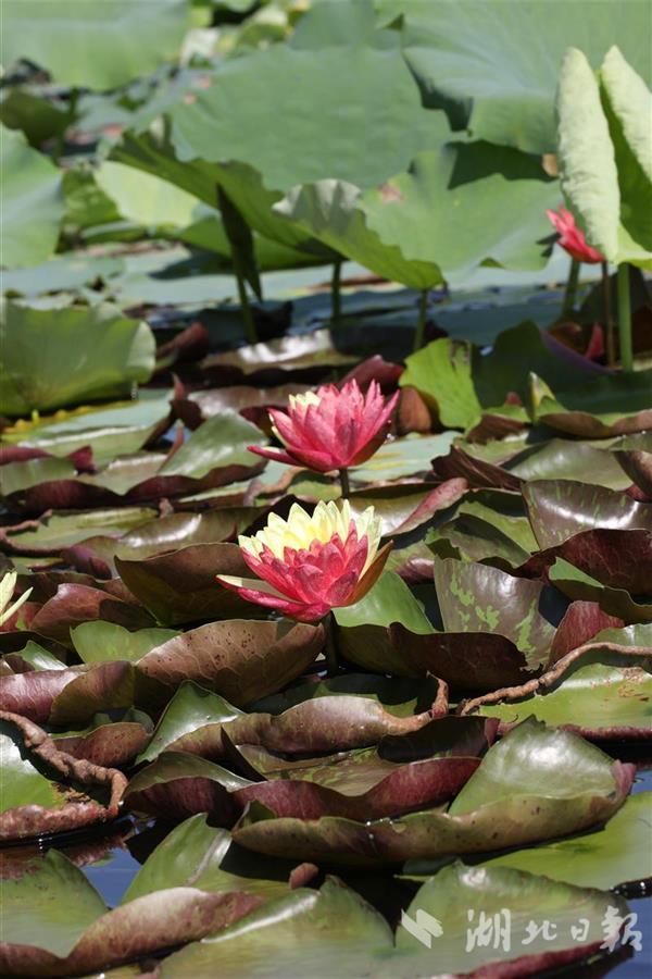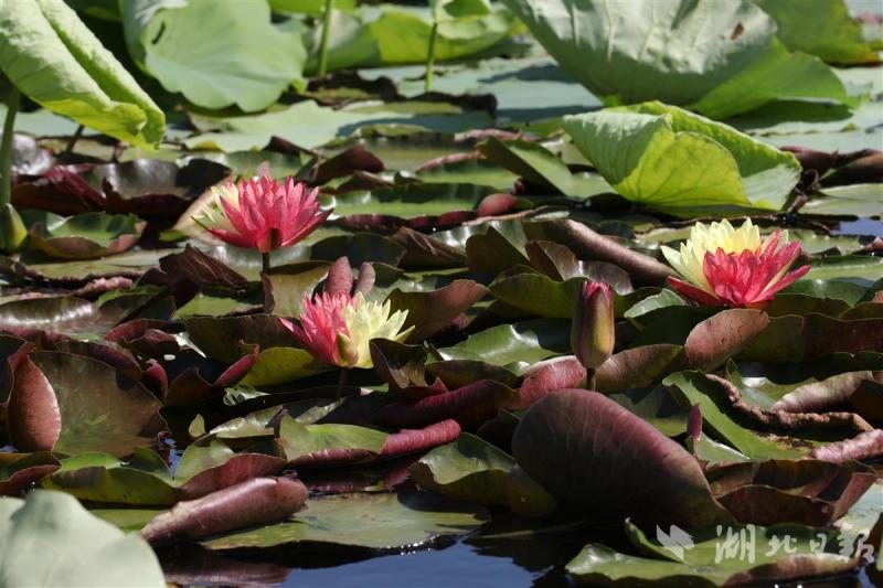 7月12日,枝江金湖国家湿地公园,几朵睡莲开出双色花瓣,一半鲜红一半鹅黄,吸引游客驻足观赏。