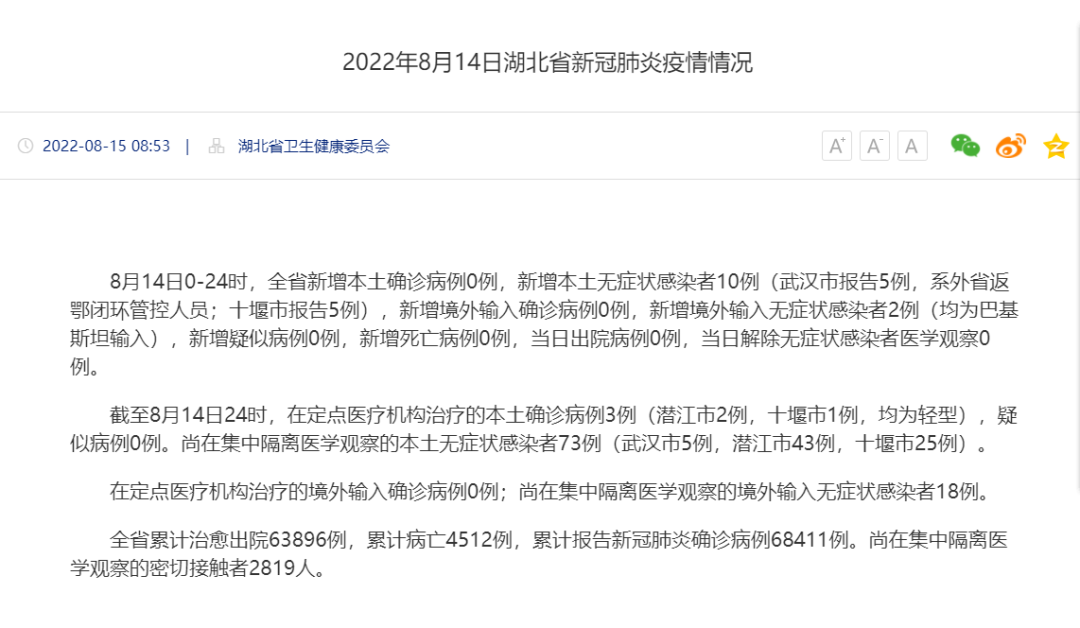 截至8月14日24时,在定点医疗机构治疗的本土确诊病例3例(潜江市2例,十堰市1例,均为轻型),疑似病例0例。尚在集中隔离医学观察的本土无症状感染者73例(武汉市5例,潜江市43例,十堰市25例)。
