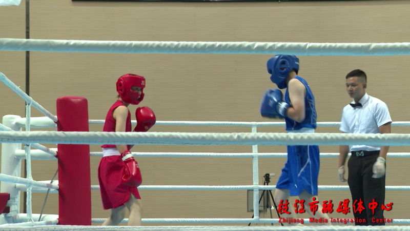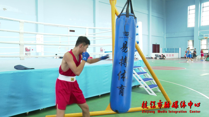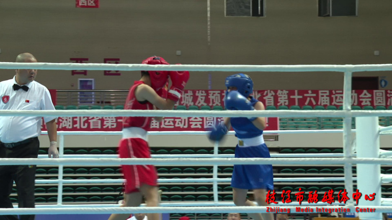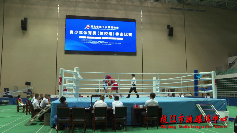 枝江融媒(记者 曹云桐) 8月16日,在枝江市文体中心体育馆,湖北省第十六届运动会青少年体育类(体校组)拳击比赛正在火热开打。