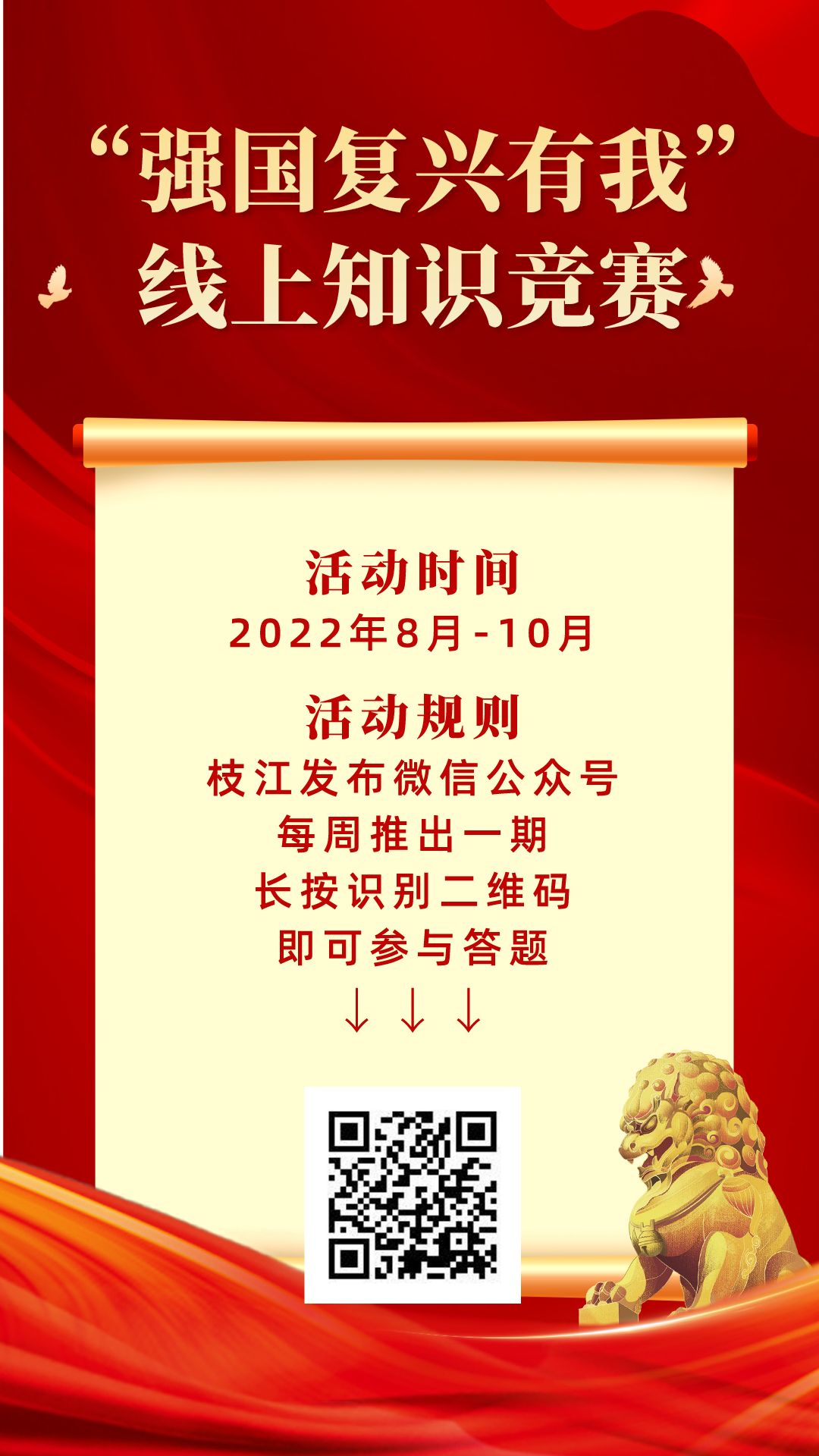 为迎接党的二十大胜利召开,枝江市委宣传部组织开展枝江市“强国复兴有我”知识竞赛活动。此次竞赛活动以习近平新时代中国特色社会主义思想,党史、新中国史、改革开放史、社会主义发展史,党的十九大和十九届历次全会精神,省第十二次党代会精神等为主要内容。从今天开始,线上知识竞赛正式启动!