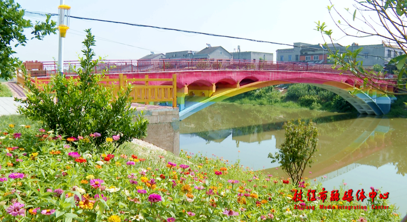 横卧人工河上的建强桥修葺一新后涂上了七彩颜色、布设了彩灯,从亲水平台凭栏欣赏恰是一弯彩虹垂挂身边,梦幻景致令人从暑气的躁动中迅速归于宁静。现在,村民们已骄傲地改称建强桥为“彩虹桥”,甚至有游客专程前来打卡拍照。临近彩虹桥的河岸边景观树成排、紫薇花盛开,太阳能自控灯射出柔和光亮,将这处节点的景致烘托得更加怡人。