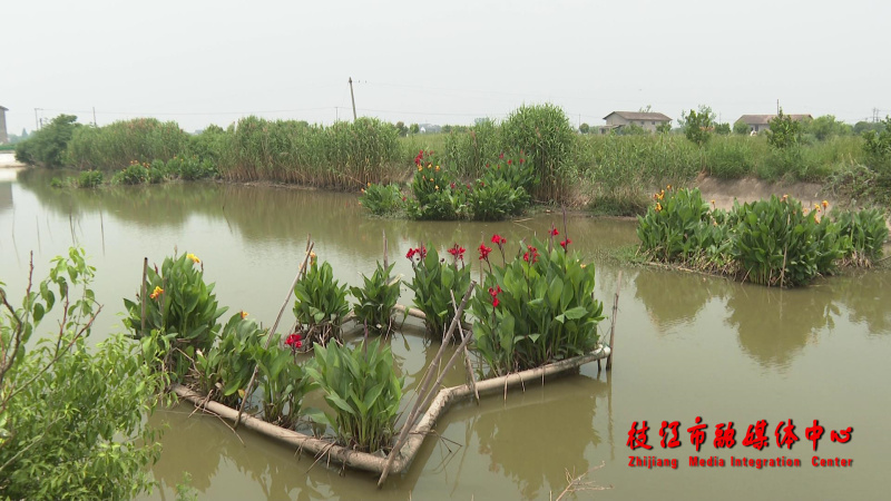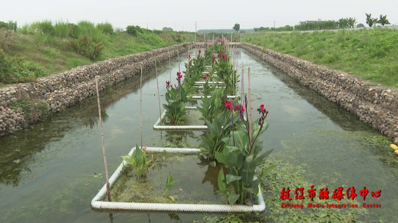 紧傍陶家湖的问安镇覃家山村境内,一条直通陶家湖的生态沟渠引人注目,用卵石砌成护坡的沟渠宽约10余米,渠中水深在一米左右,水底可见茂密水草,渠中央一字排开的生态浮床里水生生物郁郁葱葱,场景宛如一个微型的湿地公园。村内这样的主排渠共有两条,全长大约5千米,承接着周边4000余亩农田和鱼塘尾水的排放功能。