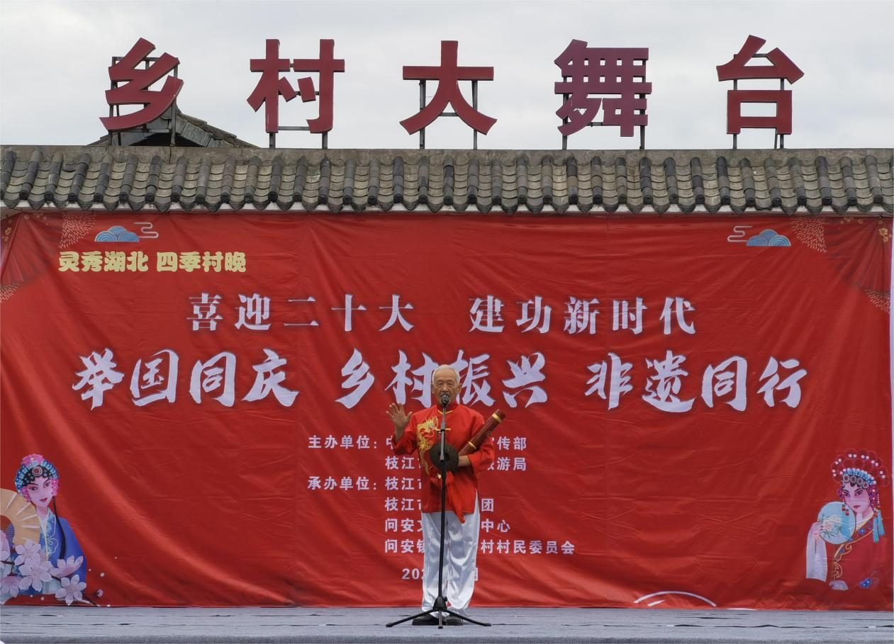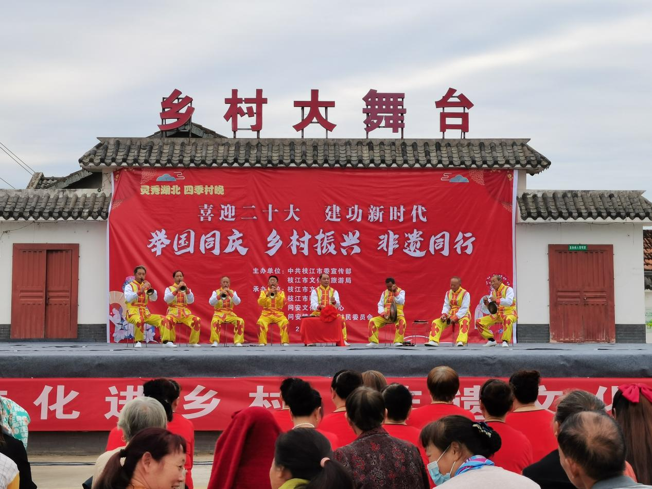 枝江融媒(通讯员 田雯 王雯憬)9月28日,由枝江市委宣传部、市文化和旅游局主办,市文化馆、市歌舞剧团承办的“喜迎二十大 建功新时代”暨“乡村振兴 非遗同行”惠民演出活动在市文化馆乡村振兴驻点村问安镇同心桥村隆重举行。