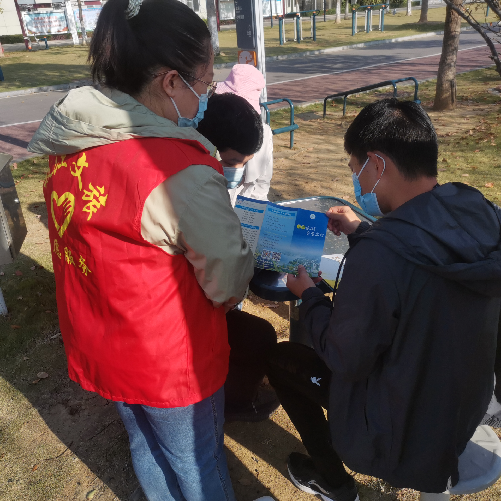 活动中,志愿者为游客发放文明旅游宣传资料,耐心解答游客提问,提示游客做好个人防疫防护、文明游览。