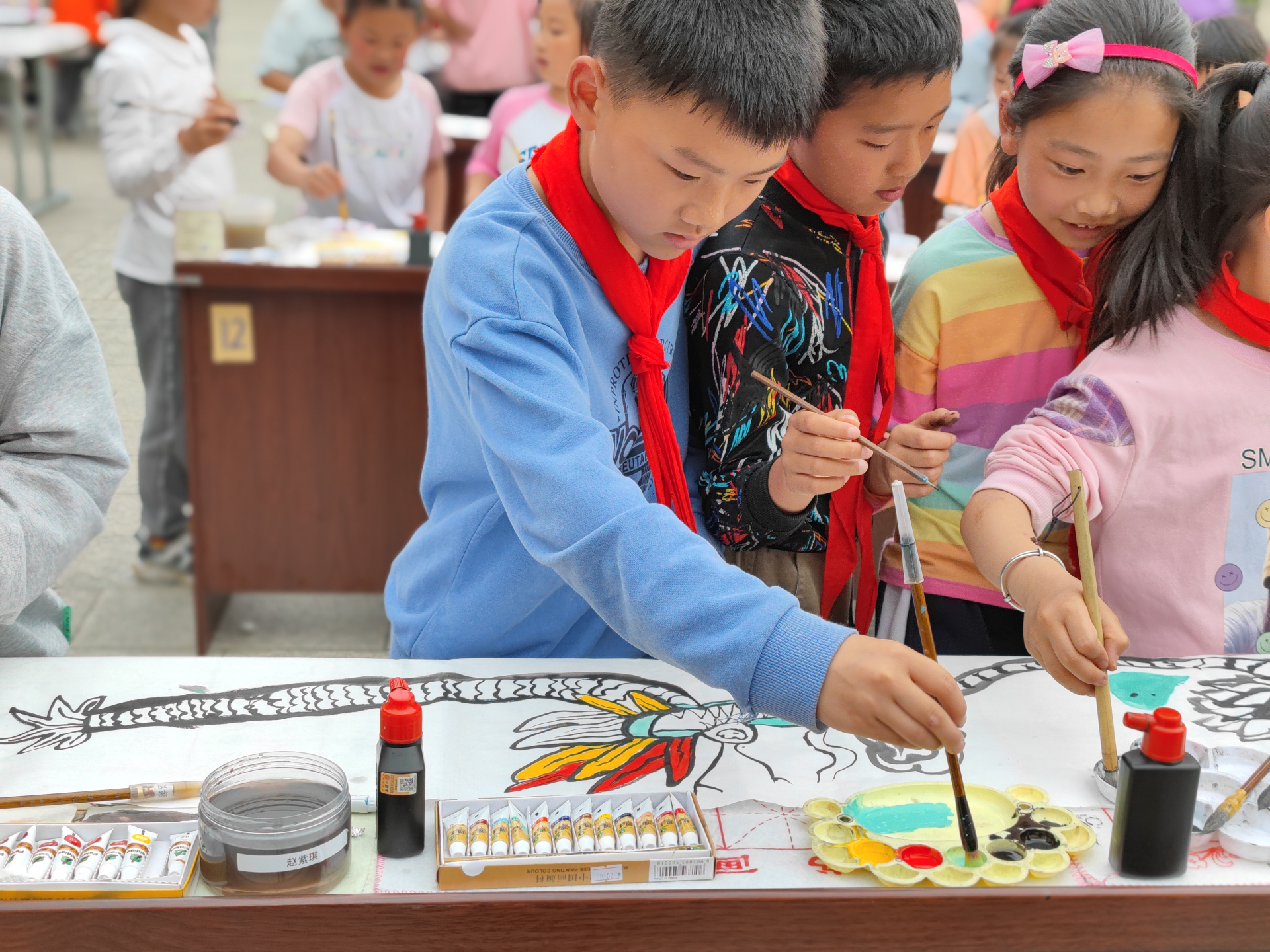 现场,孩子们兴致盎然,大胆挥毫,把自己的理解和想象创作出来,一个个神情专注,颇有小画家的风范。