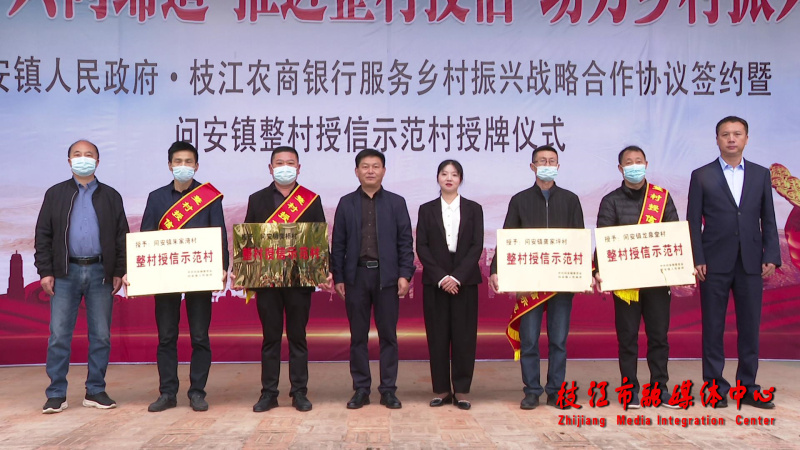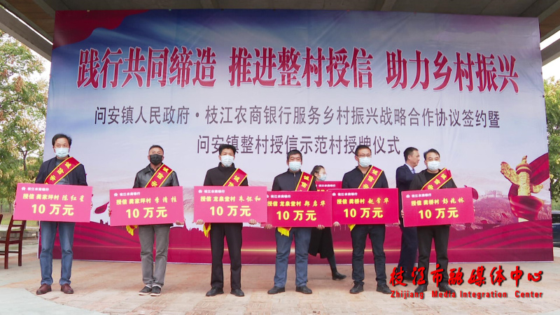 仪式现场,问安镇政府为朱家湾村、龚家坪村、龚桥村、龙泉堂村4个示范村授牌,并与枝江农商银行签署战略合作协议。同时,银行工作人员现场与授信村民、新型经营主体代表签约,体验“用信”并就相关问题现场解疑答惑。