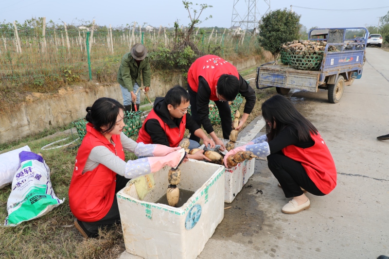在藕池边,农户和志愿者们齐上阵,一件件红马甲,在田野间格外亮眼。大家分工协作,通力配合,充分发挥不怕脏、不怕苦、不怕累的精神,经过近2个小时的辛苦努力,采挖上来的1000多斤莲藕被清洗一净,送往各个预定单位和企业。