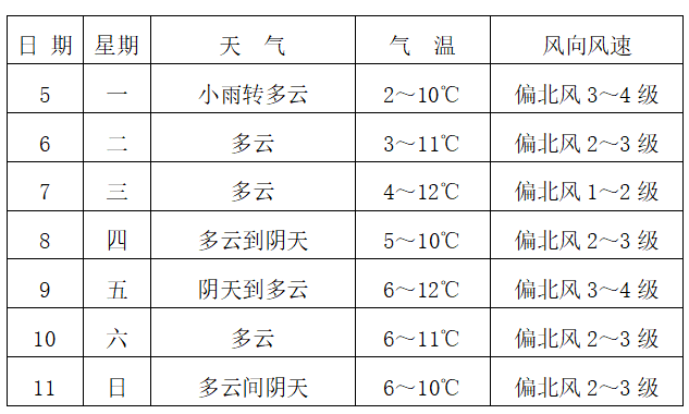 未来一周(5~11日)我市无强冷空气影响,气温缓慢回升。具体预报如下: