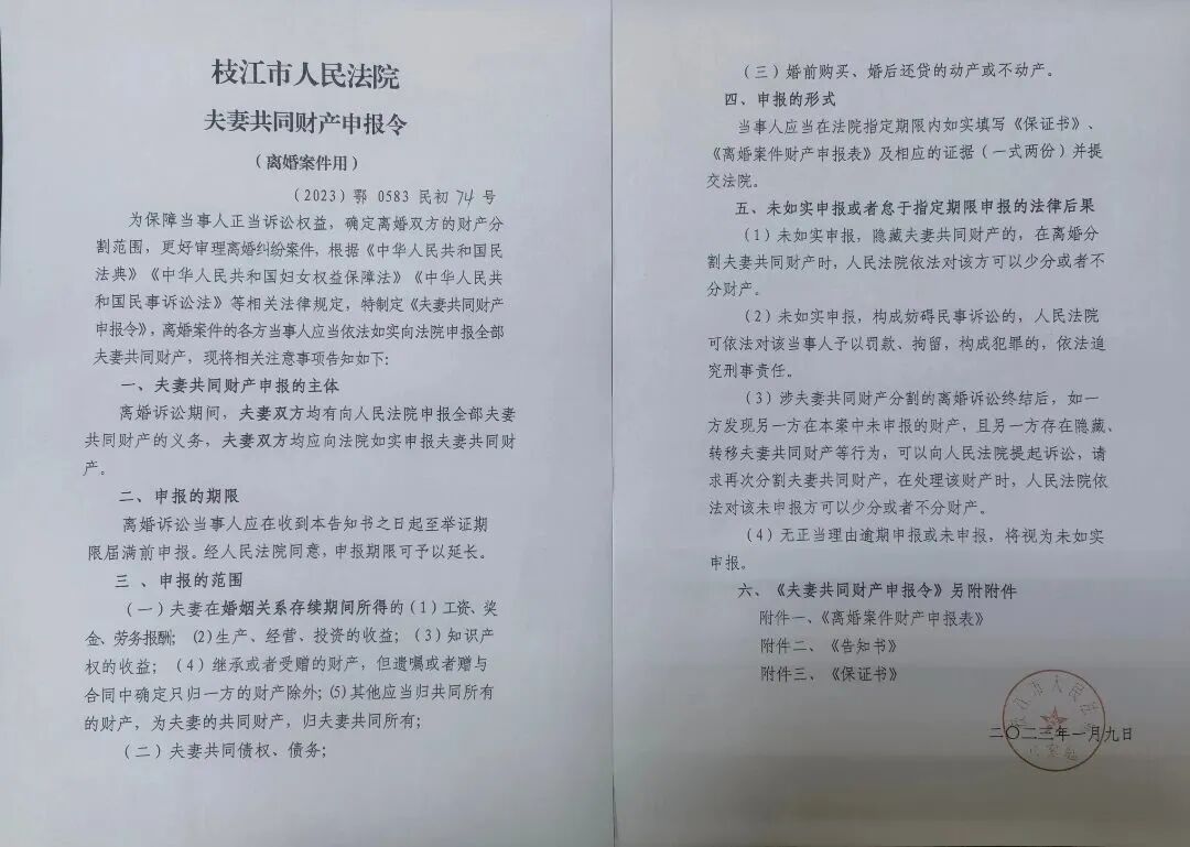 枝江融媒 1月9日,枝江市人民法院向一起离婚案件的当事人发出《离婚案件当事人夫妻共同财产申报令》。这是新修订的《中华人民共和国妇女权益保障法》今年1月1日正式施行后,枝江法院发出的本市首份《夫妻共同财产申报令》。