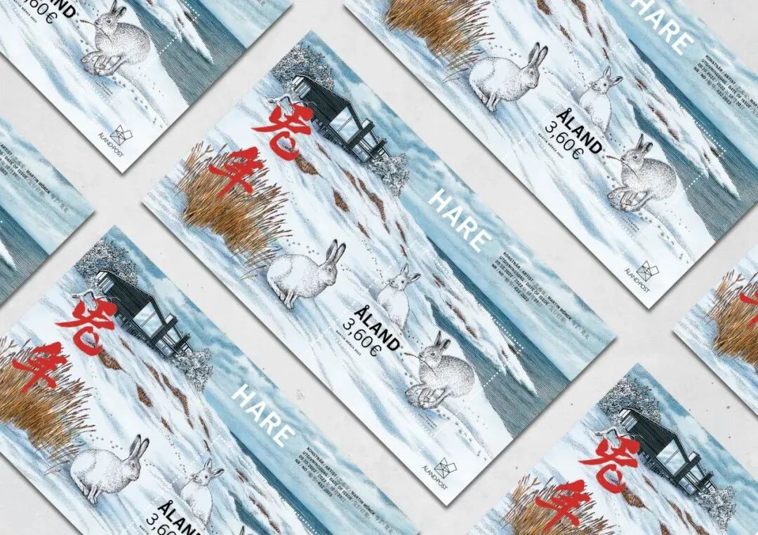 芬兰奥兰群岛发行的兔年邮票上,雪兔们身着白色“冬装”,在具有奥兰岛当地特色的度假屋周围“漫步”。奥兰邮政公关负责人古妮拉·黑格布卢姆介绍,兔年邮票设计延续了生肖系列邮票“中西结合”的特色,由国际知名雕刻制版大师马丁·莫克设计,并配有中国书法家的创作。