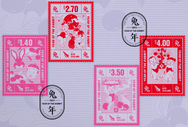 新西兰邮政发行的一套4枚兔年生肖邮票,延续了浓浓“年画风”,主题元素分别是兔子、月亮、灶神和吉祥果。