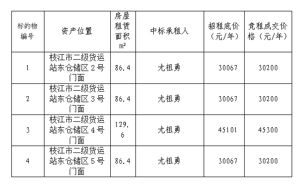 枝江市益合正运输有限责任公司于2023年2月16日上午9时30分在枝江市交通运输局四楼会议室对所属的二级货运站东仓储区2.3.4.5号门面采取现场公开竞价方式进行招租,现就招租结果公示如下: