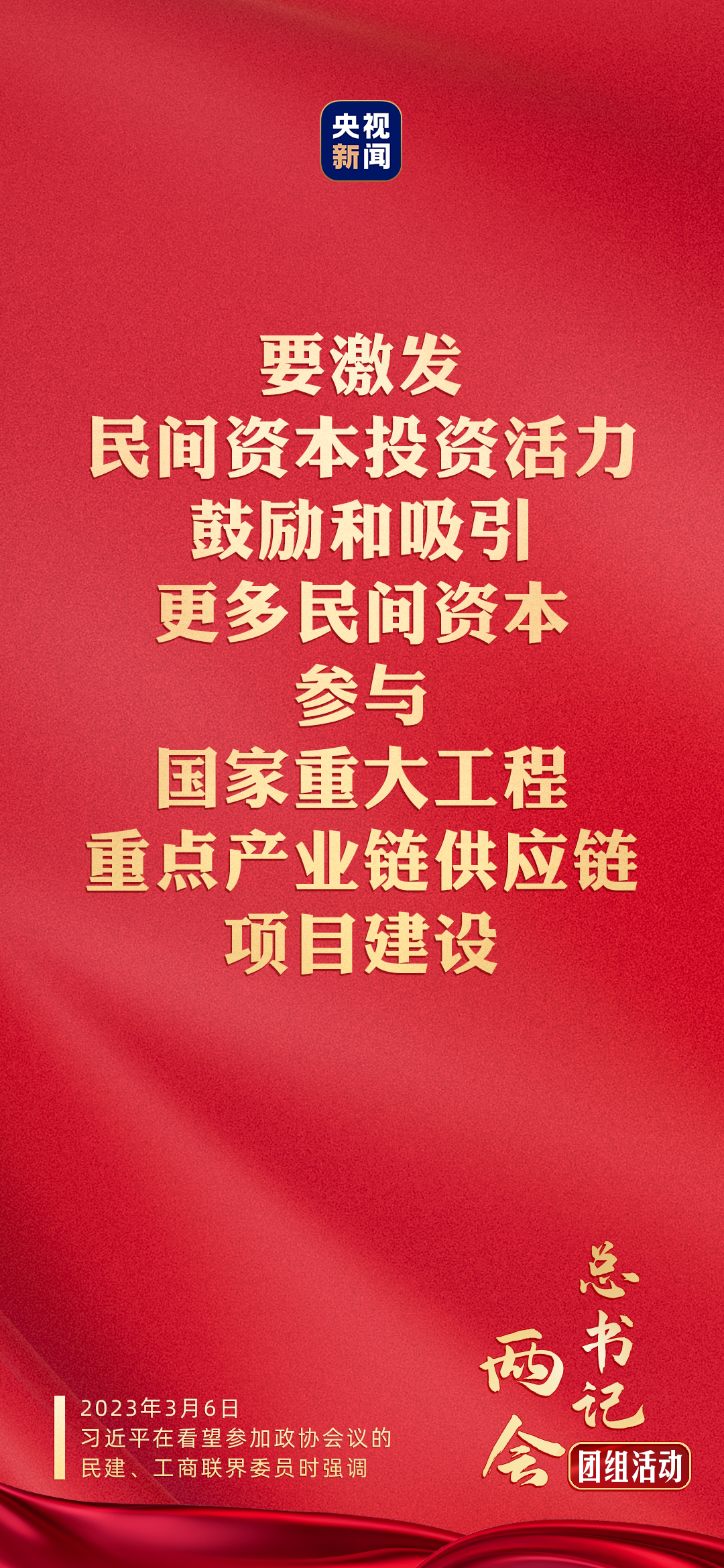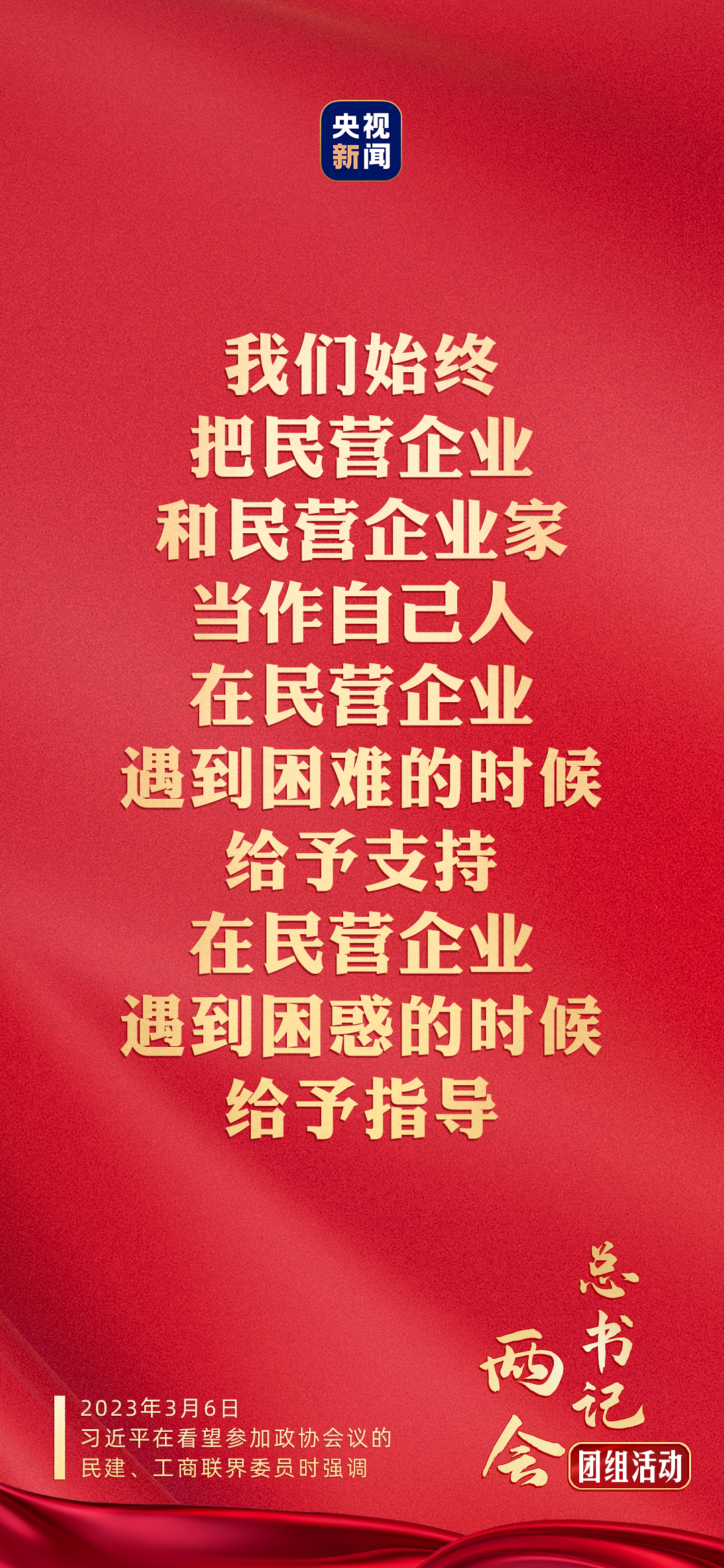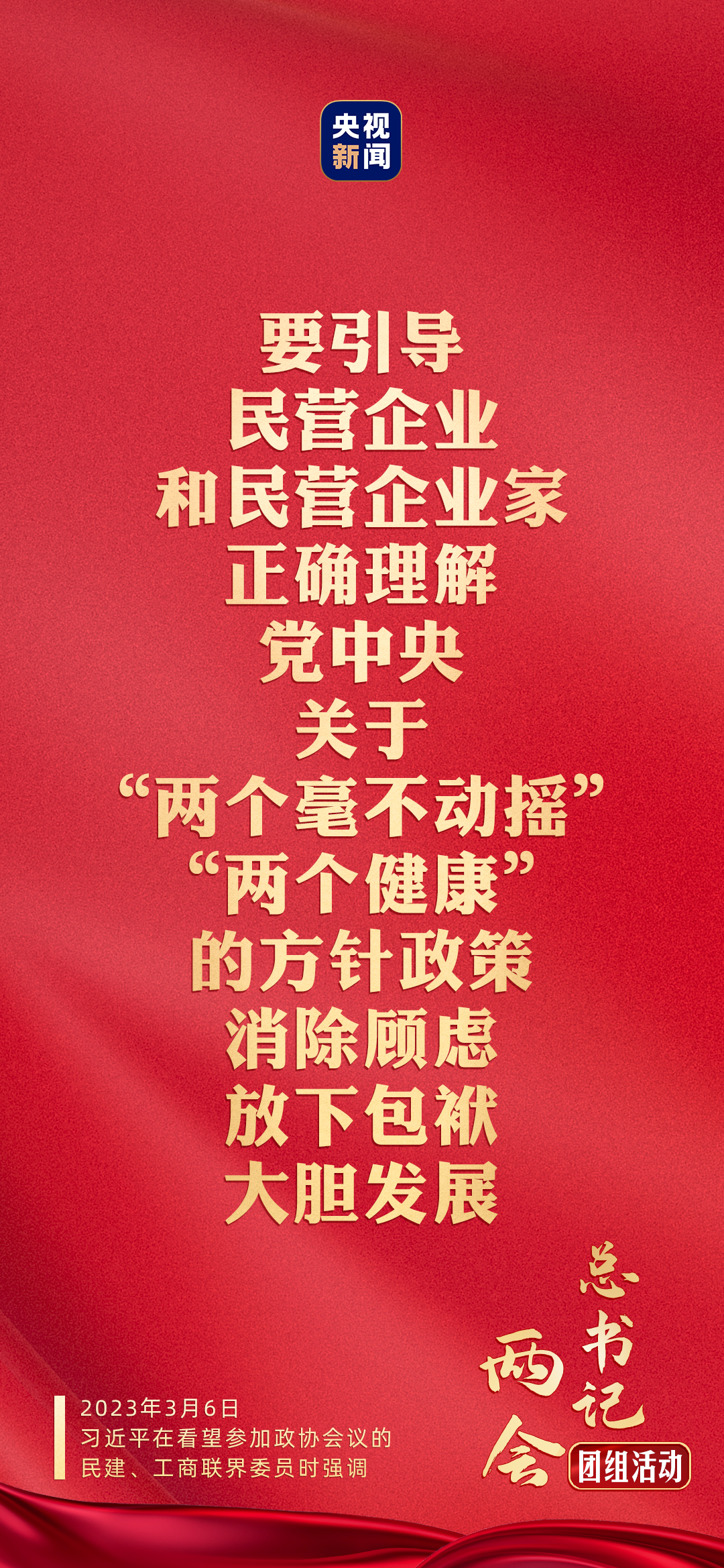 中共中央总书记、国家主席、中央军委主席习近平6日下午看望了参加全国政协十四届一次会议的民建、工商联界委员,并参加联组会,听取意见和建议。他强调,党中央始终坚持“两个毫不动摇”、“三个没有变”,始终把民营企业和民营企业家当作自己人。要引导民营企业和民营企业家正确理解党中央方针政策,增强信心、轻装上阵、大胆发展,实现民营经济健康发展、高质量发展。