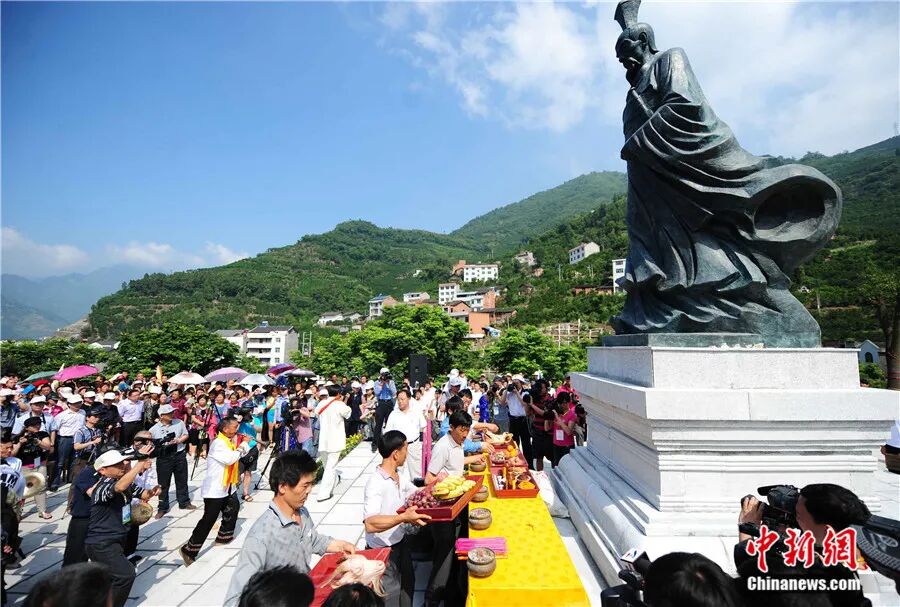 湖北秭归县归州镇,屈氏后裔在屈原像前祭祀先祖。张畅 摄