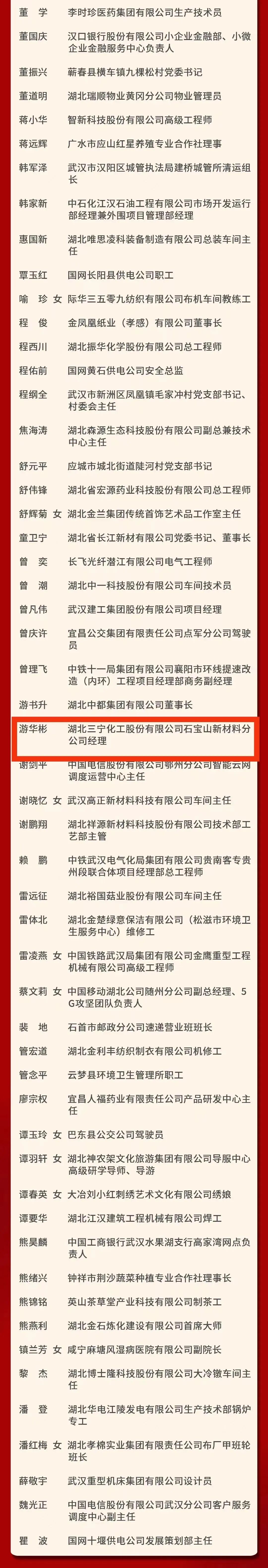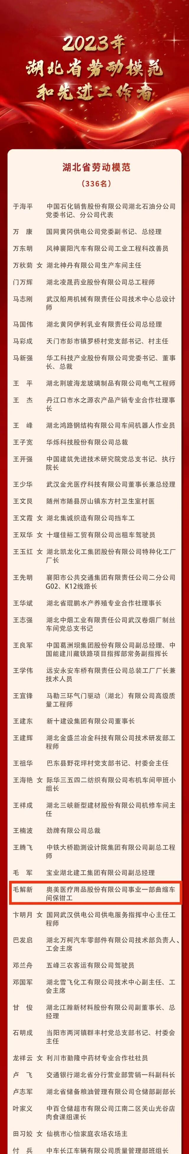 4月27日上午,2023年湖北省庆祝“五一”国际劳动节暨省劳动模范和先进工作者表彰大会在武汉隆重举行。今年共有500人获省劳动模范和先进工作者荣誉称号,其中包括省劳动模范336人,省先进工作者164人。湖北三宁化工股份有限公司石宝山新材料分公司经理游华彬、奥美医疗用品股份有限公司事业一部曲缩车间保钳工毛解新获省劳动模范荣誉称号。